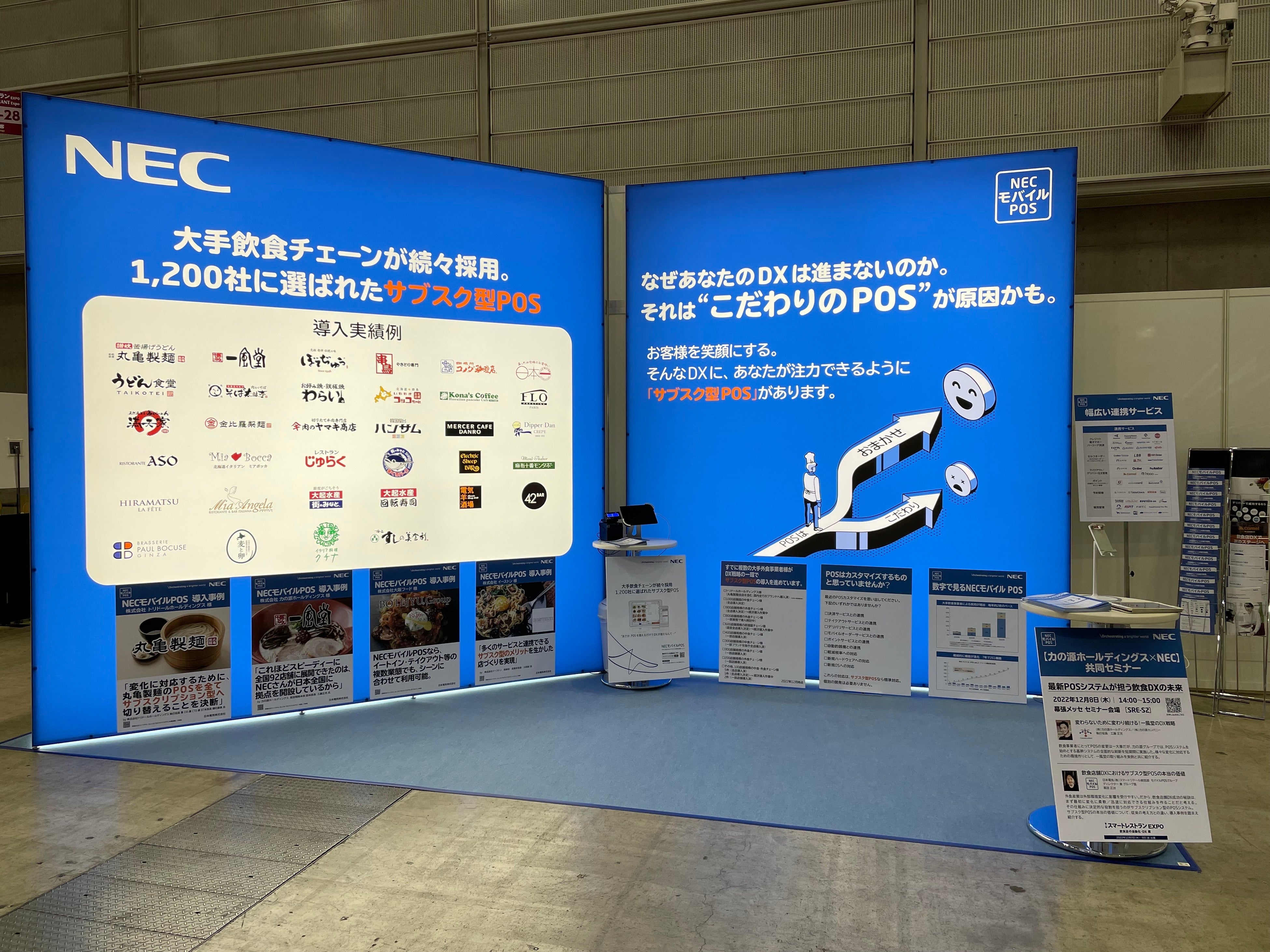 日本電気株式会社(本社:東京都港区、代表取締役執行役員社長 兼 CEO:森田 隆之、以下NEC)は、2022年12月7日(水) ~ 12月9日(金)まで開催される「スマートレストランEXPO」(主催:株式会社イノベント)にサブスク型POS「NECモバイルPOS」を出展しました。また、同イベントにて株式会社力の源ホールディングスと合同で「特別講演」へ登壇しました。