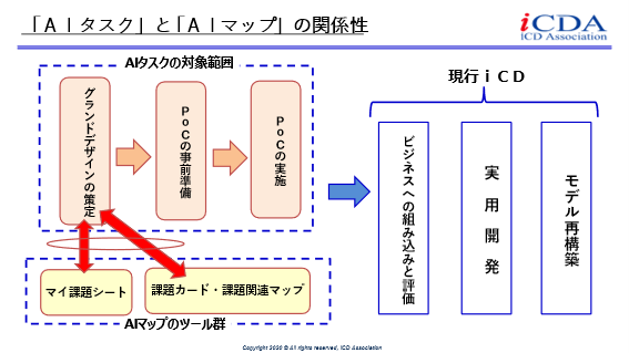 主な内容: iCD協会「AIタスク」がカバーする一連の工程のうち、「グランドデザイン策定」に対し、AI学会「AIマップ」のツール群(マイ課題シート、課題カード、課題関連マップ等)を連携させる手法を解説しています。