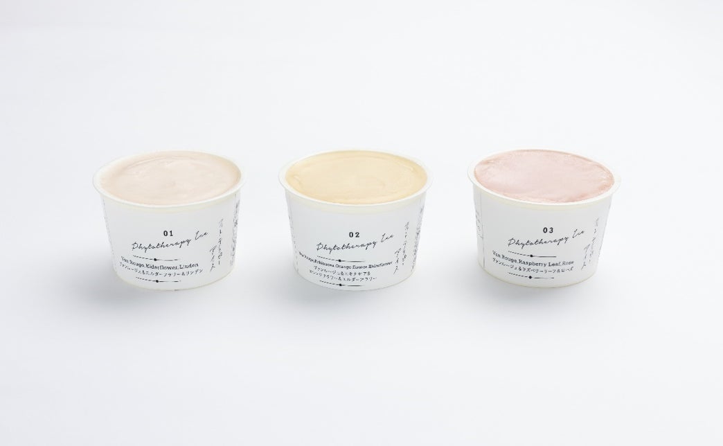 先行して好評販売中の「01」「02」「03」の3種のフィトテラピーコーディアルを、ジェラートアイスに仕立てました。3種のコーディアル全てに、ヴァンルージュという赤ブドウの葉がブレンドされています。ヴァンルージュは、赤ワインの100倍以上のポリフェノールを含み、中でもアントシアニン類とトランス-レスベラトロールという成分はエイジングケアの強い味方です。このハーブエキスシロップをアイスに仕上げ、なんとなく食欲がわかないときにも食べられる、さっぱりとした口どけとさわやかな後味が特徴的なアイスに仕上げました。