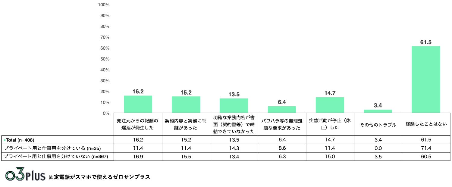 音声通話を通じてビジネスコミュニケーションを加速させるクラウドPBX「03plus」を提供する株式会社グラントン(本社:東京都渋谷区、代表取締役:井本賀津雄、以下「グラントン」)は、フリーランスに向けて「トラブルリスク実態調査」を実施しました。個人事業主/フリーランスとして発注元から委託業務を請け負うことで生計を立てる約400名に調査を行い、フリーランスとして活動していく中で発注元とのトラブルリスクをどのように対策しているかを明らかにしました。昨今、フリーランスの人口は急速に増え続けており、コロナによる働き方多様化も加速したことでビデオ会議やチャットツールなど発注元とのコミュニケーション手段が多様化しています。手段が増えることでトラブルリスクが高まる中、フリーランスの方々がトラブルのリスク回避にどれくらい意識しているかを発表します。