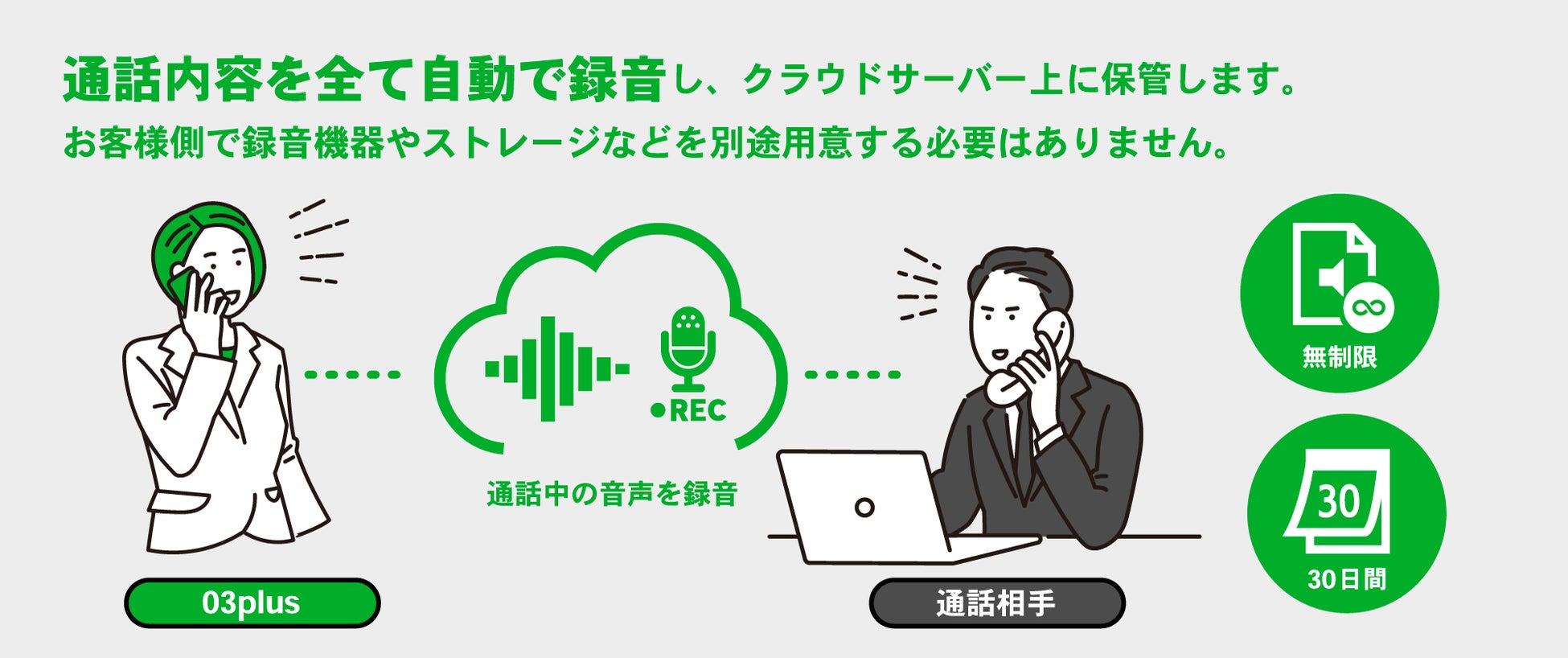 03plusは通話内容を全て自動で録音し、クラウドサーバー上に保管します。お客様側で録音機器やストレージなどを別途用意する必要はありません。03plusなら発注元と曖昧で終わってしまった会話や「言った言わない」等の会話によるトラブルリスク対策が可能になります。