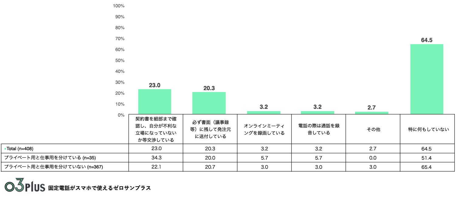 発注元とのトラブル回避の対策をとっているフリーランスはわずか3割程度。普段の連絡手段に「電話を使用する」と回答した人は約5割存在する中、約6割が「通話内容を記録していない」と回答