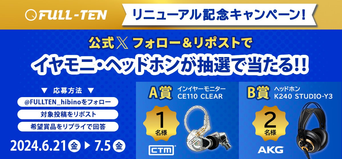 イヤモニやヘッドホンが抽選で当たる!FULL-TENリニューアルを記念したフォロー&リポストプレゼントキャンペーン実施のお知らせ