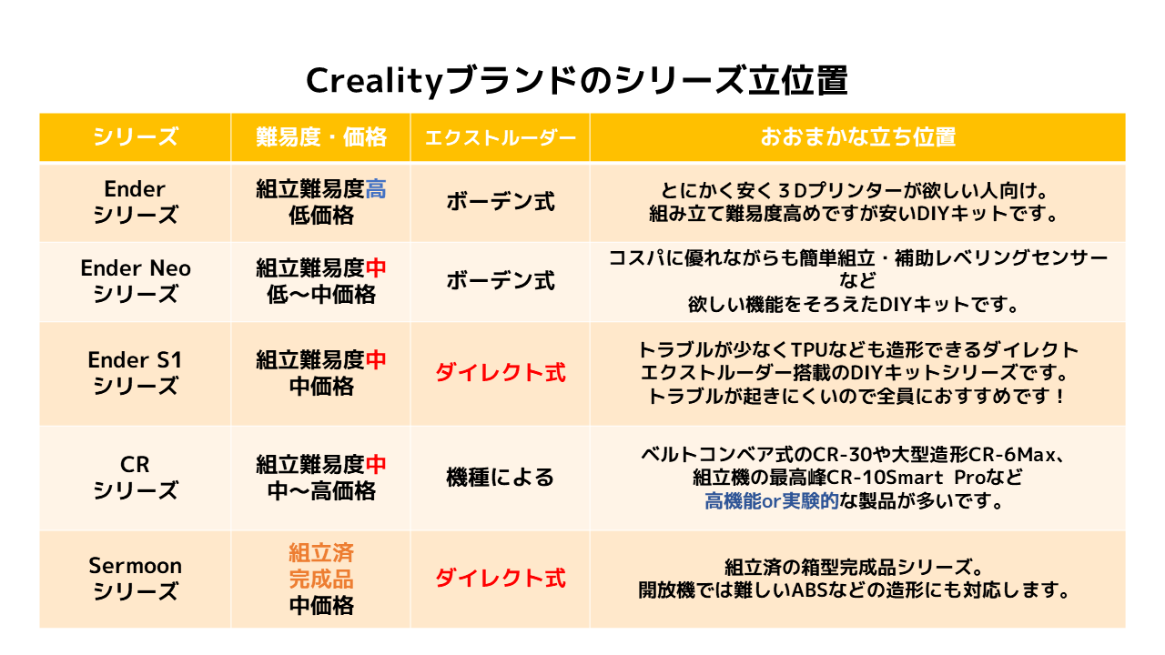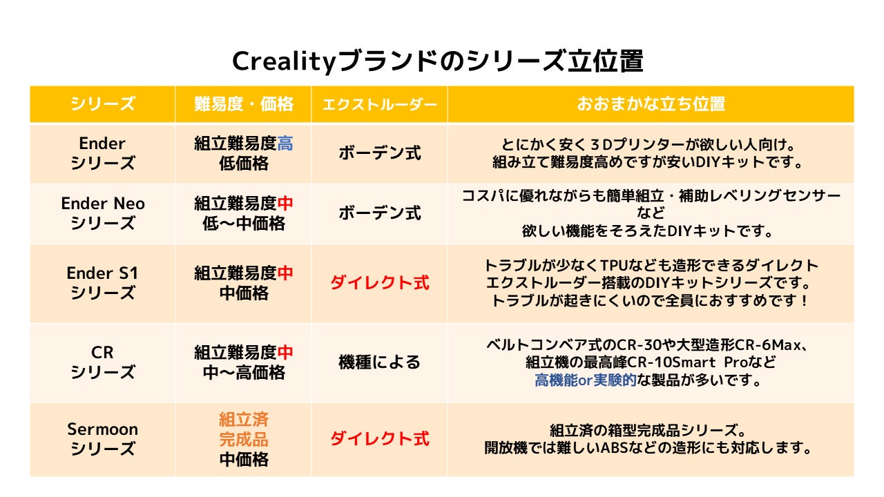 補助レベリングセンサー搭載やカラーディスプレイ・組立難易度の低いモジュール式の採用など、コストパフォーマンスに優れた価格帯ながら便利で欲しい機能を格安機ながらも揃えたシリーズです。