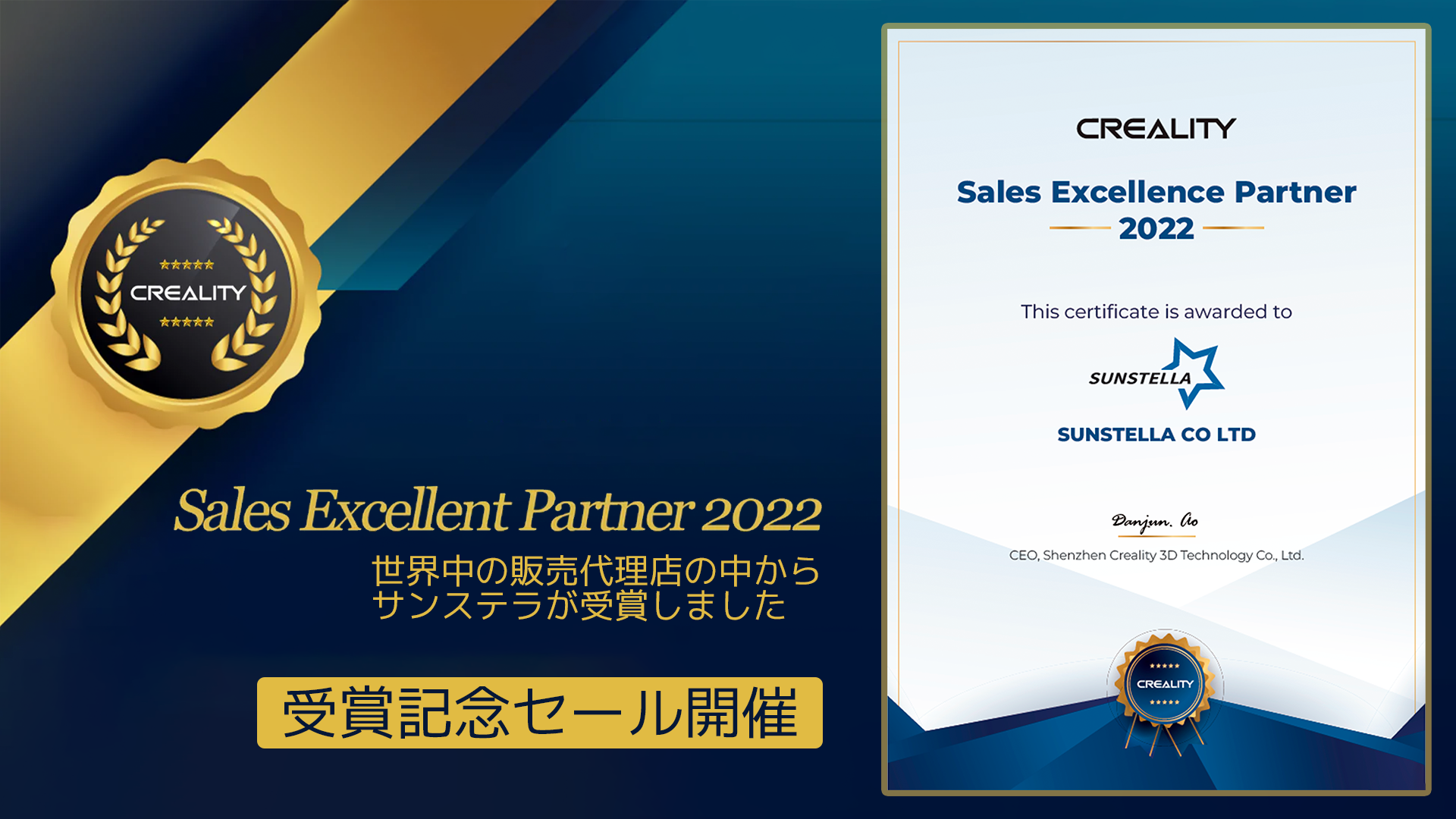 株式会社サンステラは、Creality社のSales Excellent Partner 2022にて、世界中の販売代理店の中から株式会社サンステラが受賞しました。