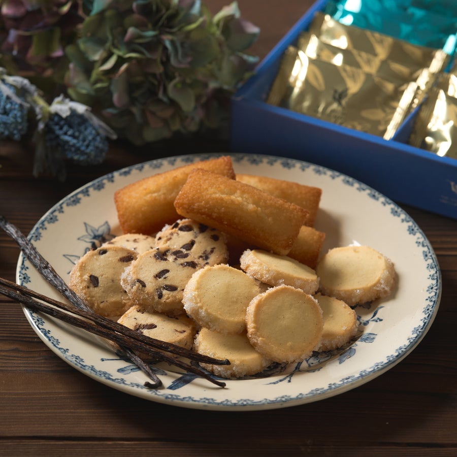 フランス産発酵バターを100%使用し、ブルボンバニラの香りを最大限引き出す配合にこだわっています。アーモンドプードルと隠し味のお塩で、さっぱりとしながらも深い味わいです。ブルボンバニラの芳醇な甘い香りと、さっくりとしたクッキーです。