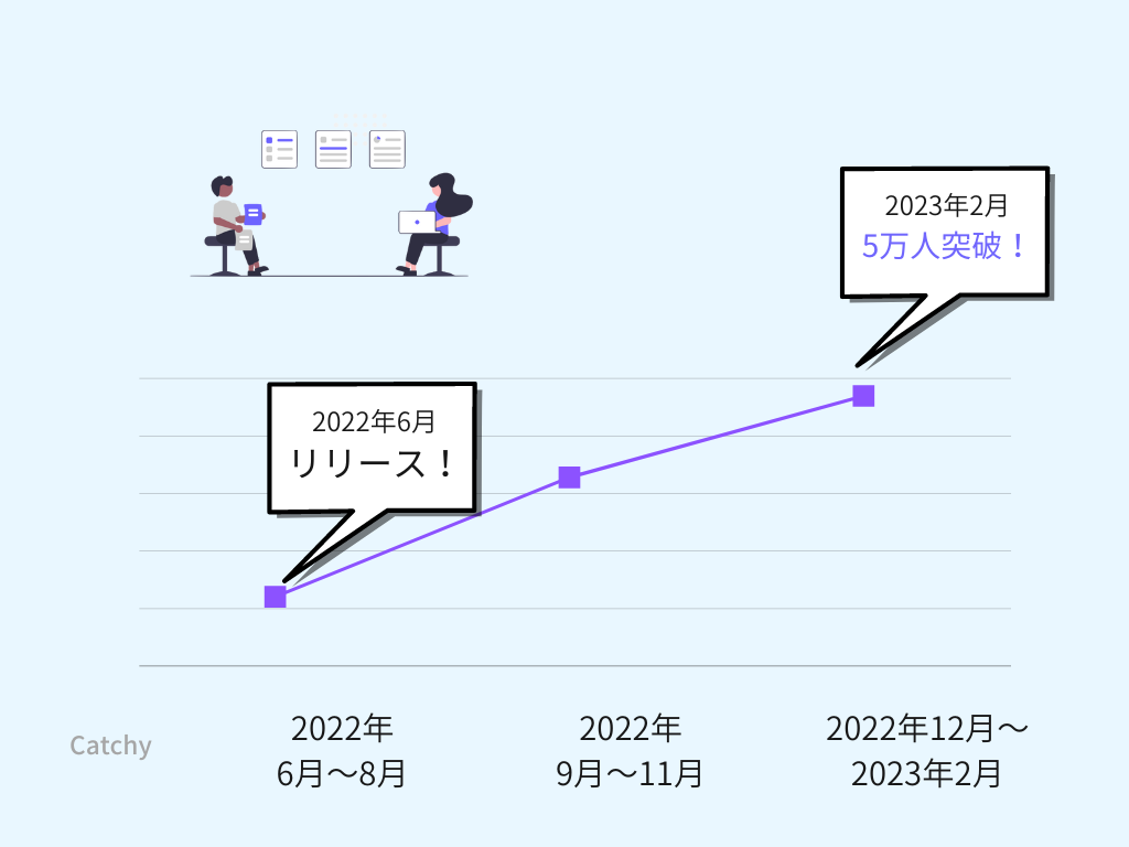 AI ライティングアシスタント「Catchy(キャッチー)」は、2022年6月にリリースしました。2023年2月下旬に会員数5万人を突破するまでに下記のような推移をたどりました。