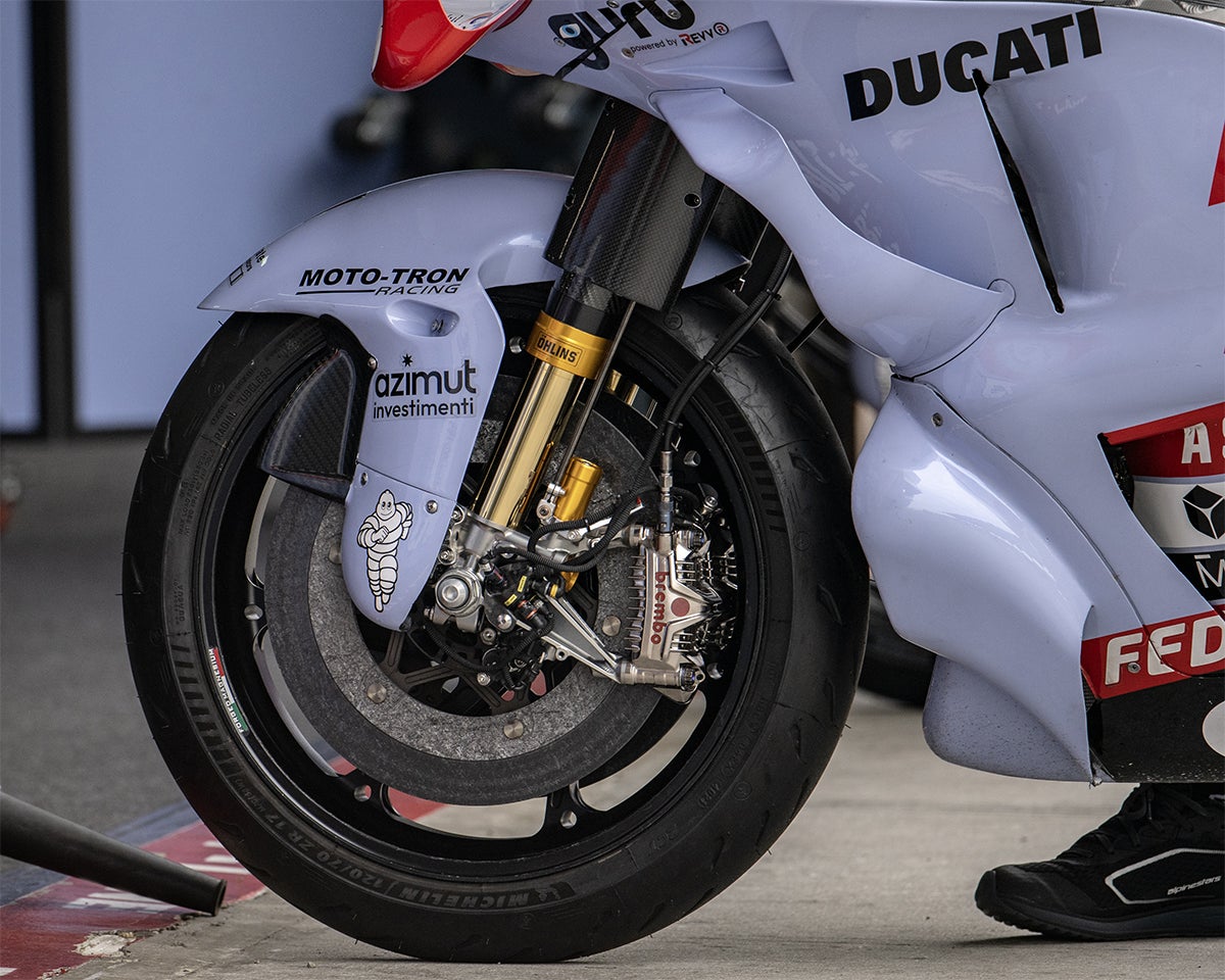 2024年シーズンは、11チーム中8チームがマルケジーニ製鍛造マグネシウムホイールを採用します。マルケジーニ製ホイールの前後輪にはY字型スポークが5本または7本配置されています。ブレンボグループの一員であるマルケジーニ製の軽量ホイールは、加速時や方向転換時に加え、コーナー進入時の制動、大きなバンク角(最大60°)でのコーナリング、フルスロットルでのコーナー立ち上がりといった、マシンが傾く非常に重要な場面でその軽さによるメリットを発揮します。