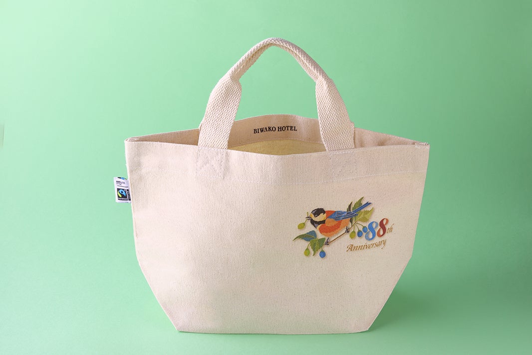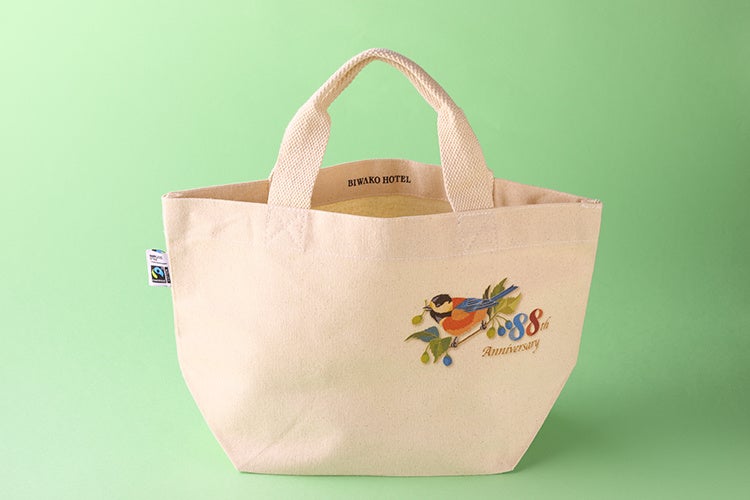 フェアトレード認証生産者から基準に従って調達された認証コットンを使用したエコバッグ。商品の使用を通して、発展途上国の人々の生活改善や自立を支援します。また、ビニール袋の使用削減から琵琶湖の環境保全に繋がるようにとの思いで製作しました。ナチュラルなオフホワイトの生地表面には88周年ロゴを配し、内面には琵琶湖ホテルロゴをさり気なく入れています。サブバッグやお弁当入れ、ちょっとしたお買い物等に幅広くご利用いただけるサイズです。