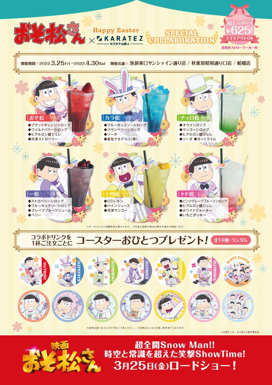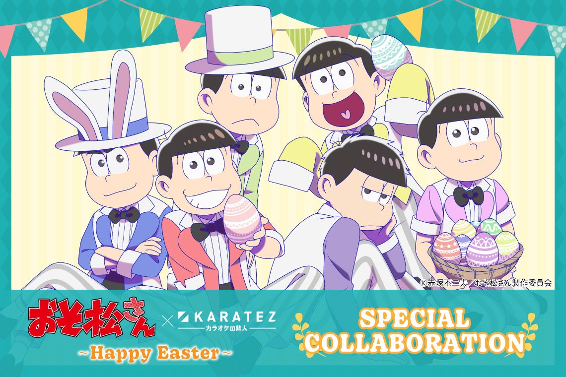 株式会社鉄人化計画(所在地:東京都目黒区、代表取締役社長:根来拓也)は、当社が運営する「カラオケの鉄人」の首都圏3店舗において、赤塚不二夫の漫画『おそ松くん』を原作にした「TVアニメ『おそ松さん』×カラオケの鉄人~Happy Easter~」と冠したコラボレーションキャンペーン(以下「コラボ」)を、「Snow Man(スノーマン)」が主演の実写版映画「おそ松さん」の公開と同日の2022年3月25日(金)より開催します。