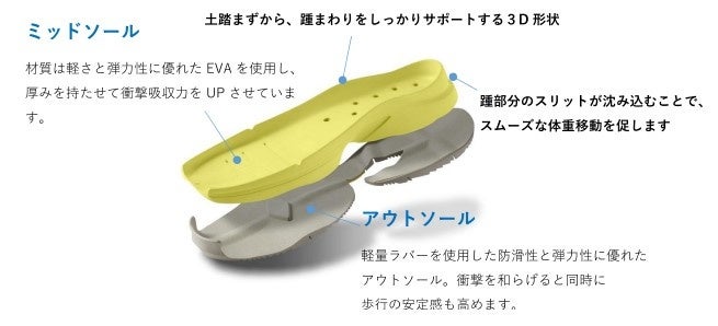 昨年秋に発売した「レザーレースアップジップスニーカーWoW10」をベースにしたメッシュタイプのスニーカーです。インソールには好評の「フィットフォルム※1 WoW10」を使用。さらにレザータイプと同様に「WoWソール」を採用し、アウトソールはローリング歩行※2を促す形状で、ミッドソールは土踏まずアーチをサポートし、踵の横ブレを防ぐ3D 形状となっています。