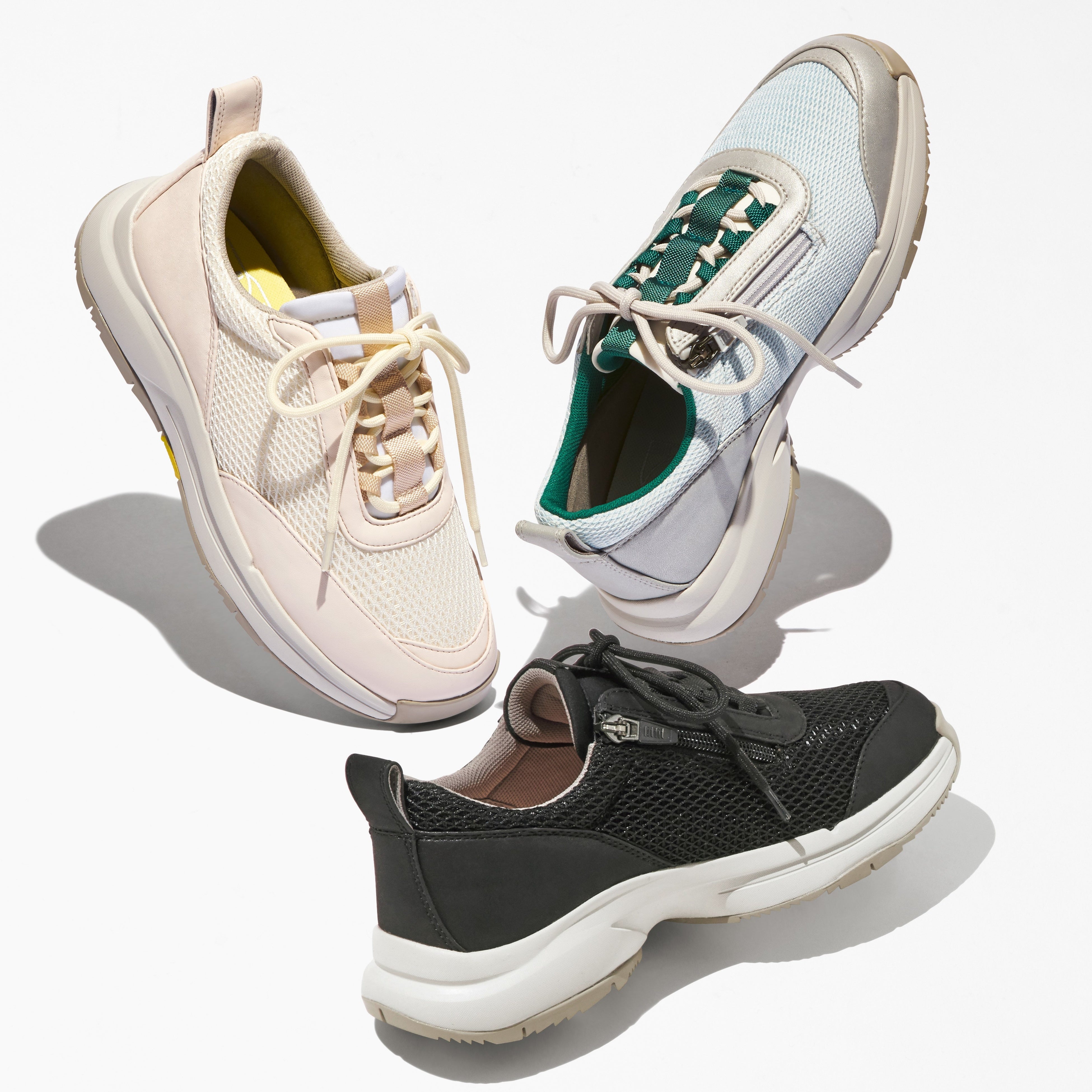 2)ブラックにはオフホワイトのソールを使用することで、夏らしく軽やかな印象に、アイボリーはライトベージュのナイロンテープやつま先パーツとのコンビネーションにより、真っ白なスニーカーよりも女性らしい印象に仕上げています。アイスブルーは今年らしいグリーンテープの差し色がしなやかで甘くなり過ぎず、いずれもスカートスタイルにもパンツスタイルにもピッタリです。