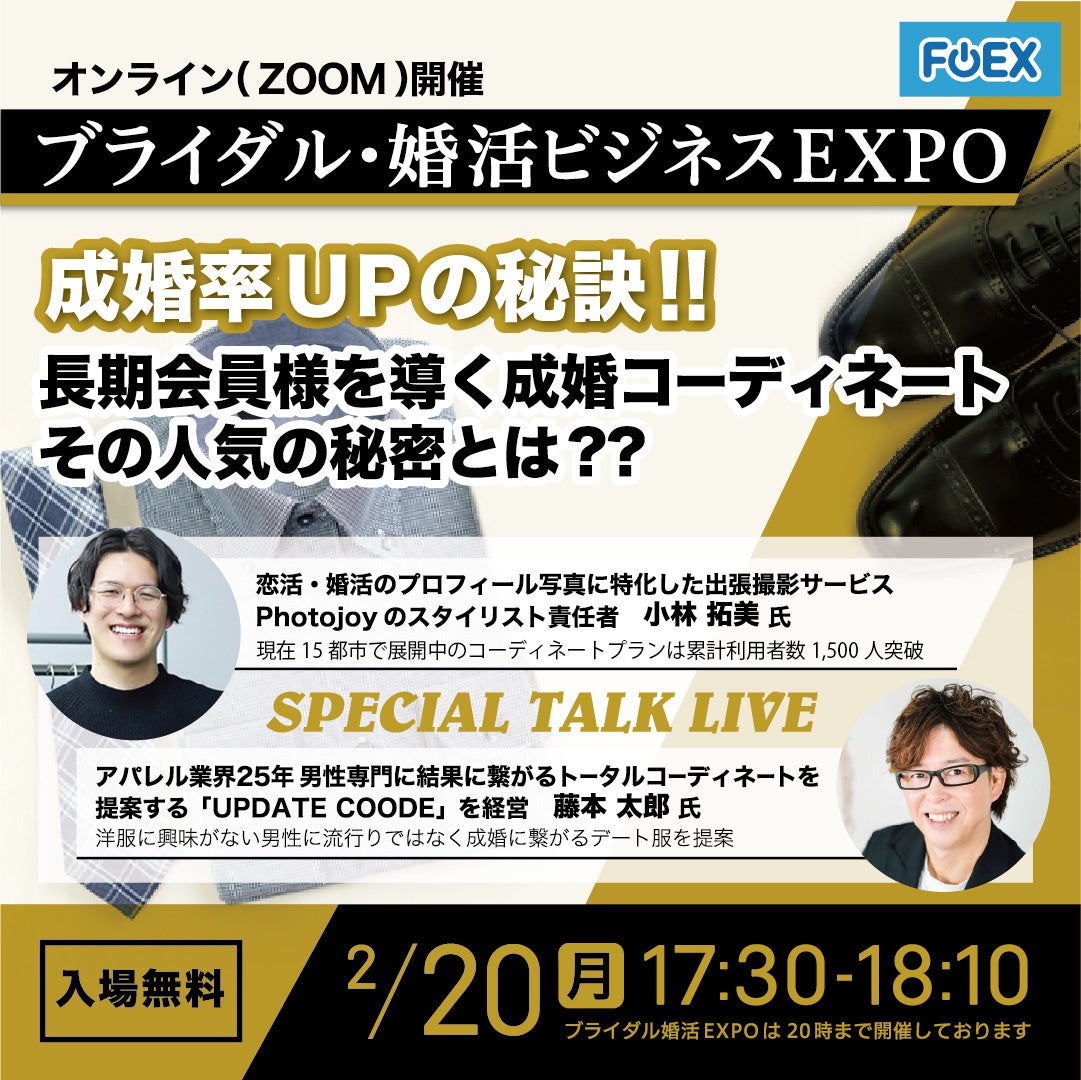 フラスコオンラインEXPO®︎(FOEX®︎)を運営する合同会社スマートルーチェ(東京都渋谷区)は2月20日開催の「ブライダル・婚活ビジネスEXPO」で、恋活・婚活のプロフィール写真に特化した出張撮影サービスの Photojoy のスタイリスト責任者 小林 拓美 氏 と アパレル業界25年 男性専門に結果に繋がるトータルコーディネートを提案する「UPDATE COODE」を経営 藤本 太郎 氏を迎えてスペシャルトークライブを開催します。