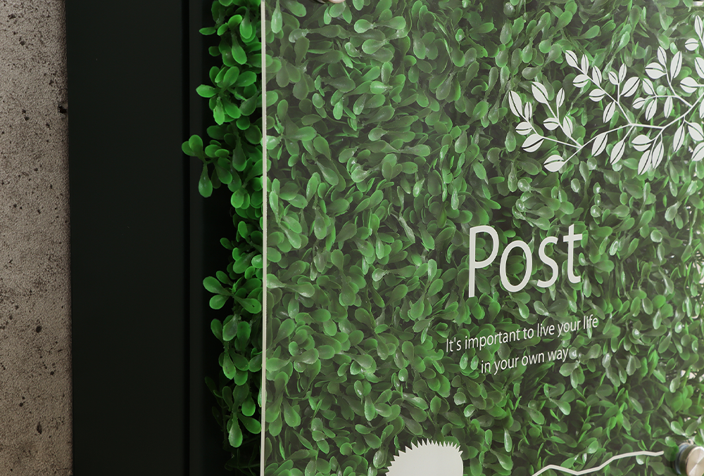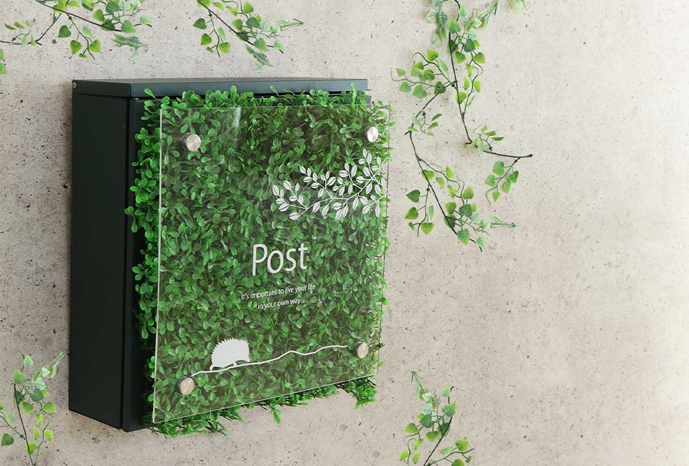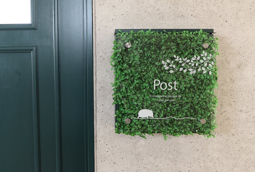 森を思わせるような立体的なフェイクグリーンは、エントランスを清々しく印象付けます。また幸運のシンボルと言われているアニマルイラストを前面のアクリル板に配し、文字とイラストが浮かび上がっているようなハッとさせるデザインとなっています。スタイリッシュで幸福感のあるポストのご紹介です。