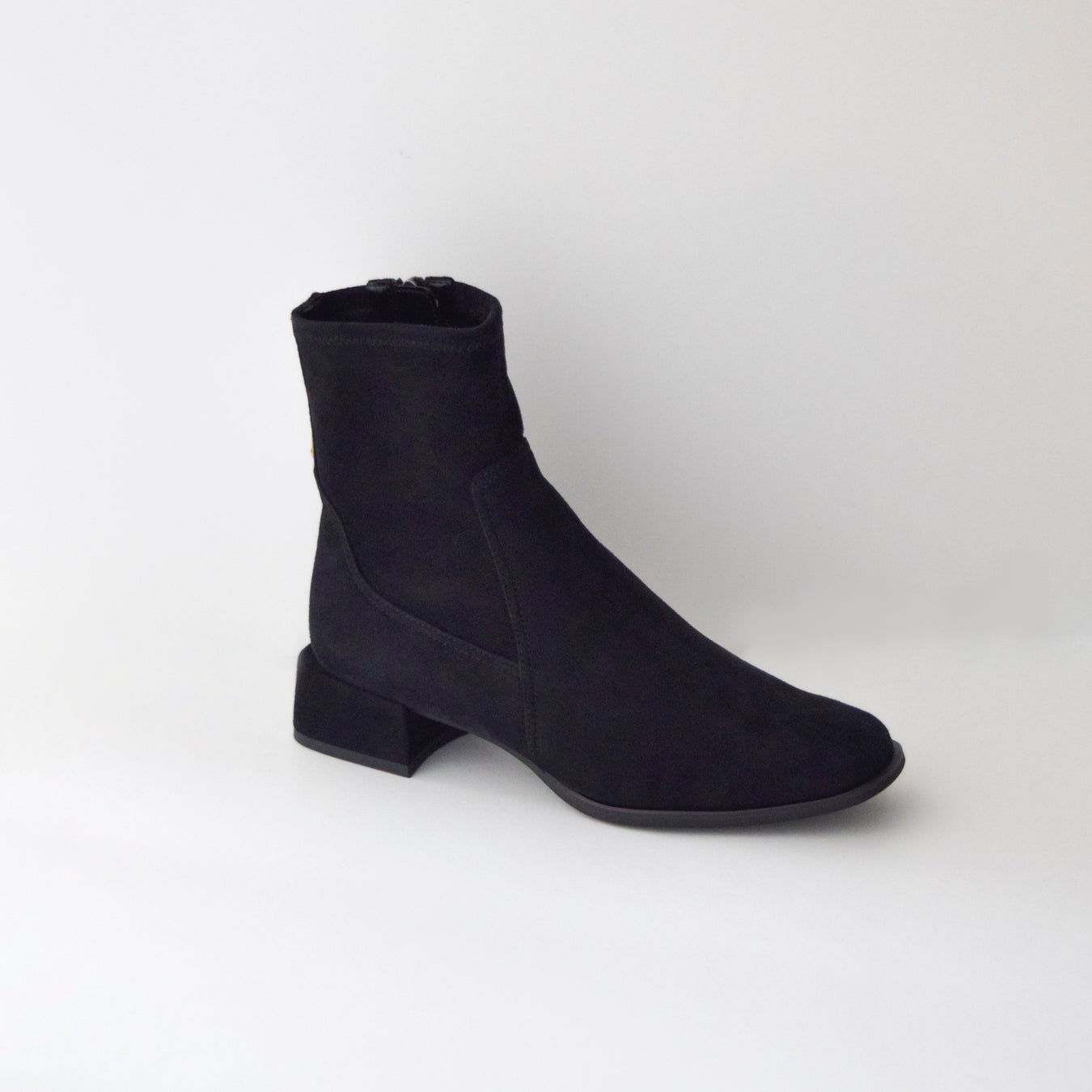 ゆったりめの木型を使用したスクエアトウのストレッチショートブーツ。かかと側に配したチェーンモチーフが華やかさをプラス。ピースを効かせた底周りと、オーバーブロックヒールがシンプルなシルエットにアクセントを持たせ、モダンで今っぽい雰囲気の一足。