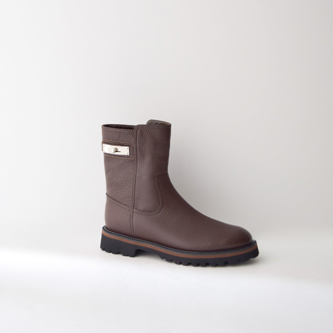 絶妙な丈感、まるみのあるトウと程よいボリューム感のソールが女性らしさを演出してくれます。ターンロック金具がリッチな印象。辛口かつ品のあるブーツがコーディネートをきりッと引き締めてくれる。