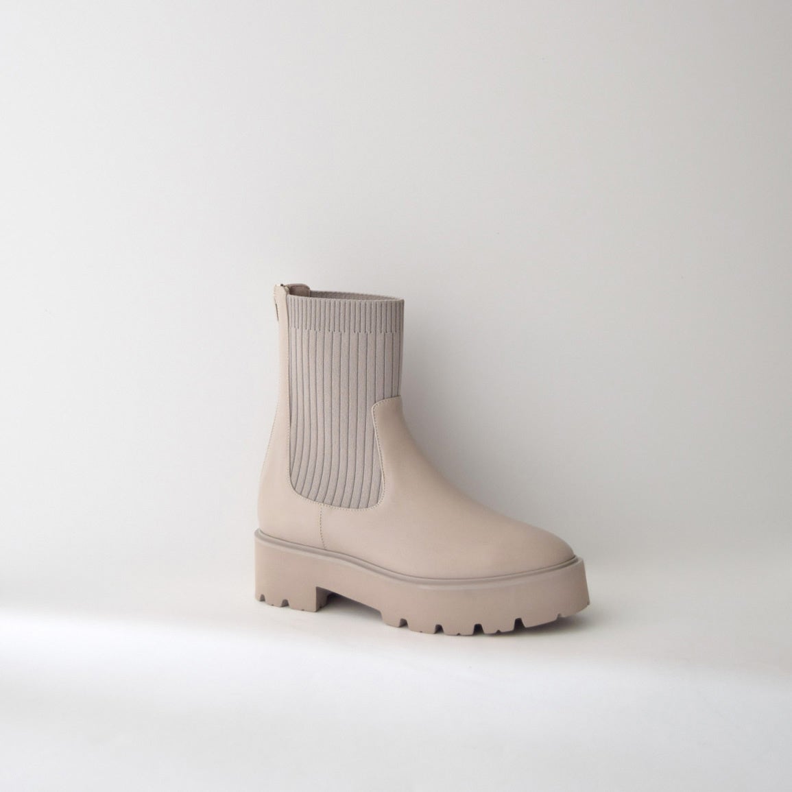 ボリュームのある厚底と細身のニットシャフトのバランスがかわいいショートブーツ。
