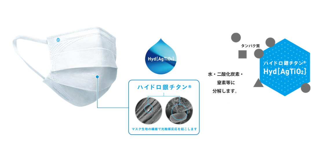 医師の発想で生まれたハイドロ銀チタンは、酸化チタンに銀・ハイドロキシアパタイトを複合させ、タンパク質を分解して水や二酸化炭素・窒素などに変えるDR.C医薬独自のクリーン技術です。
