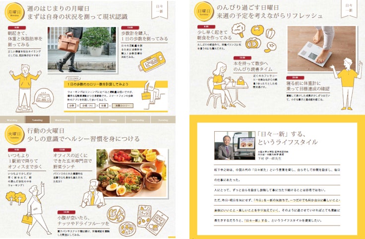 肥満症の研究において国内外で高い評価を受ける大阪大学大学院医学系研究科、健康計測機器を製造・販売する株式会社タニタ、当社の製品開発力、この三者の強みを活かし、肥満症の改善/対策に向けた取り組みを今後も推進していきます。パンフレットでは、健康づくりのために日々の生活で意識したい「新しいライフスタイル事例」を、月曜日から日曜日までの7日間に分けて提案しています。忙しい毎日の中でつい後回しにしがちな自身の健康改善に意識を向け、日常生活へセルフメディケーションを取り入れるヒントになればと考えています。