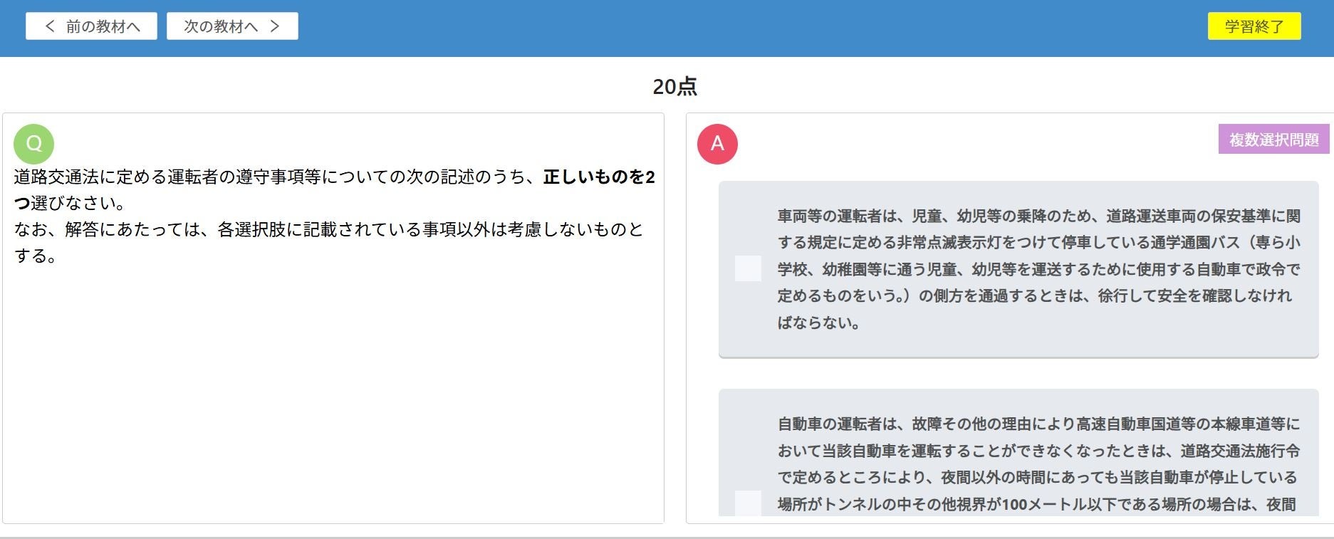 こうした声を受け、今回『グッドラーニング!』では、運行管理者試験の過去問題をもとに、設問と解説をセットで学べる講座 を新たに追加しました。本講座は、現在の試験方式である「CBT(Computer Based Testing)」を意識した学習環境を提供します。パソコンの画面上で問題を解き、即座に解説を確認するサイクルを繰り返すことで、本番の「試験形式への慣れ」と「知識の定着」を図ることが可能です。