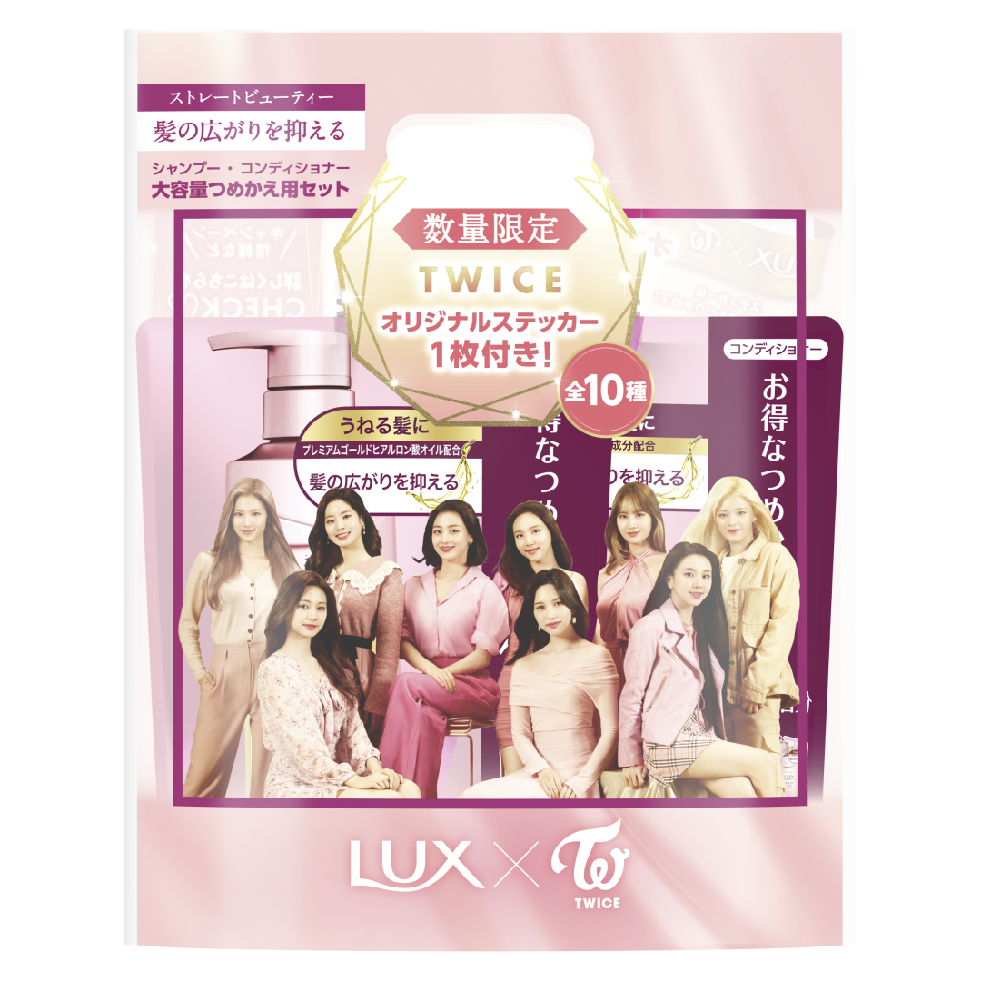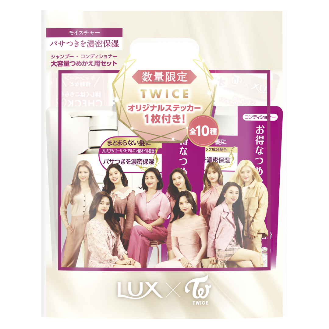 今回「LUX×TWICEコラボ第2章」を記念し、「ラックス スーパーリッチシャイン TWICEステッカー付き 大容量つめかえペア」を数量限定で販売開始します。3月のコラボ実施時に寄せられた多くのファンの方からの声にお応えし、ステッカー付きのオリジナルセットを販売することに至りました。全10種のステッカーのうち、いずれか1種が同封されています。10種のうち1種はシークレットですが、是非この機会にゲットしてみてください。