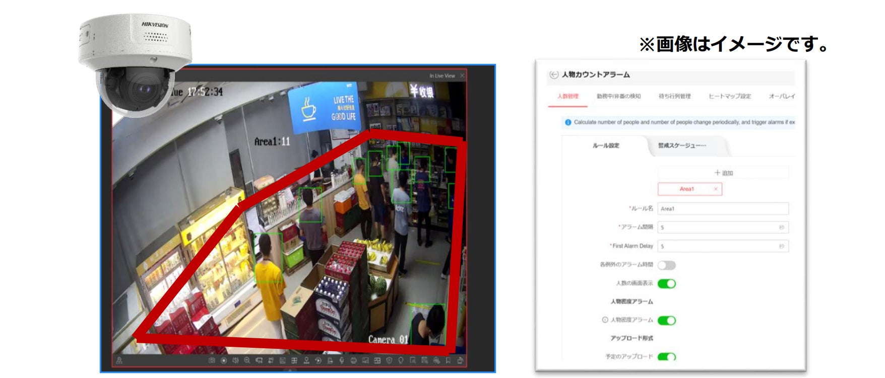 2025年4月に新しくリリースされたAIカメラバージョンにより、エリア人数カウント機能を活用すると、指定されたエリア内の人数を推測できます。人口密度が一定のしきい値を超えた場合、自動的に管理者へ通知を行うことで、混雑の悪化を未然に防ぎます。
