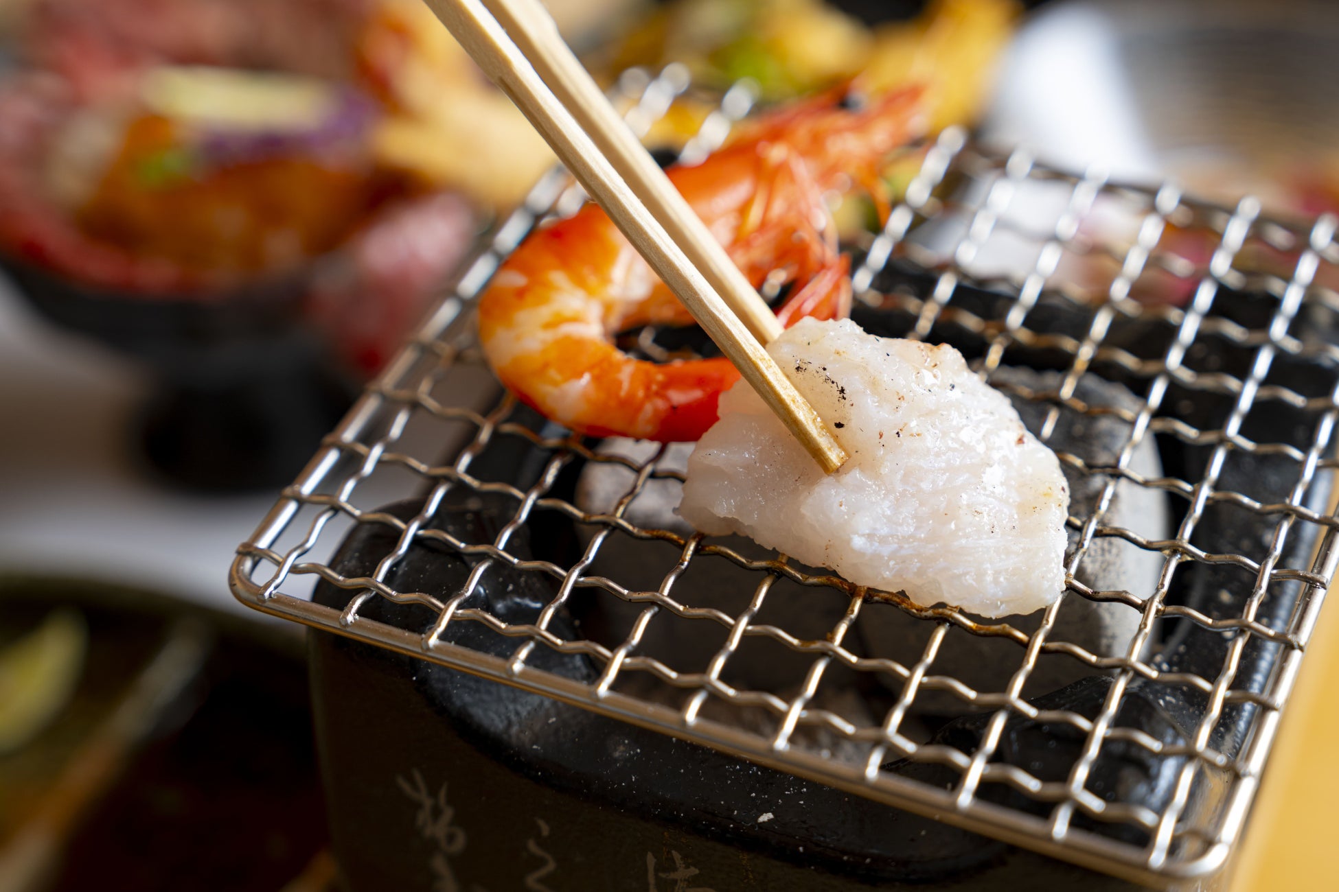 お祝いの席に欠かせない鯛と、縁起の良い海老を香ばしく炭火で焼き上げお召し上がりください。