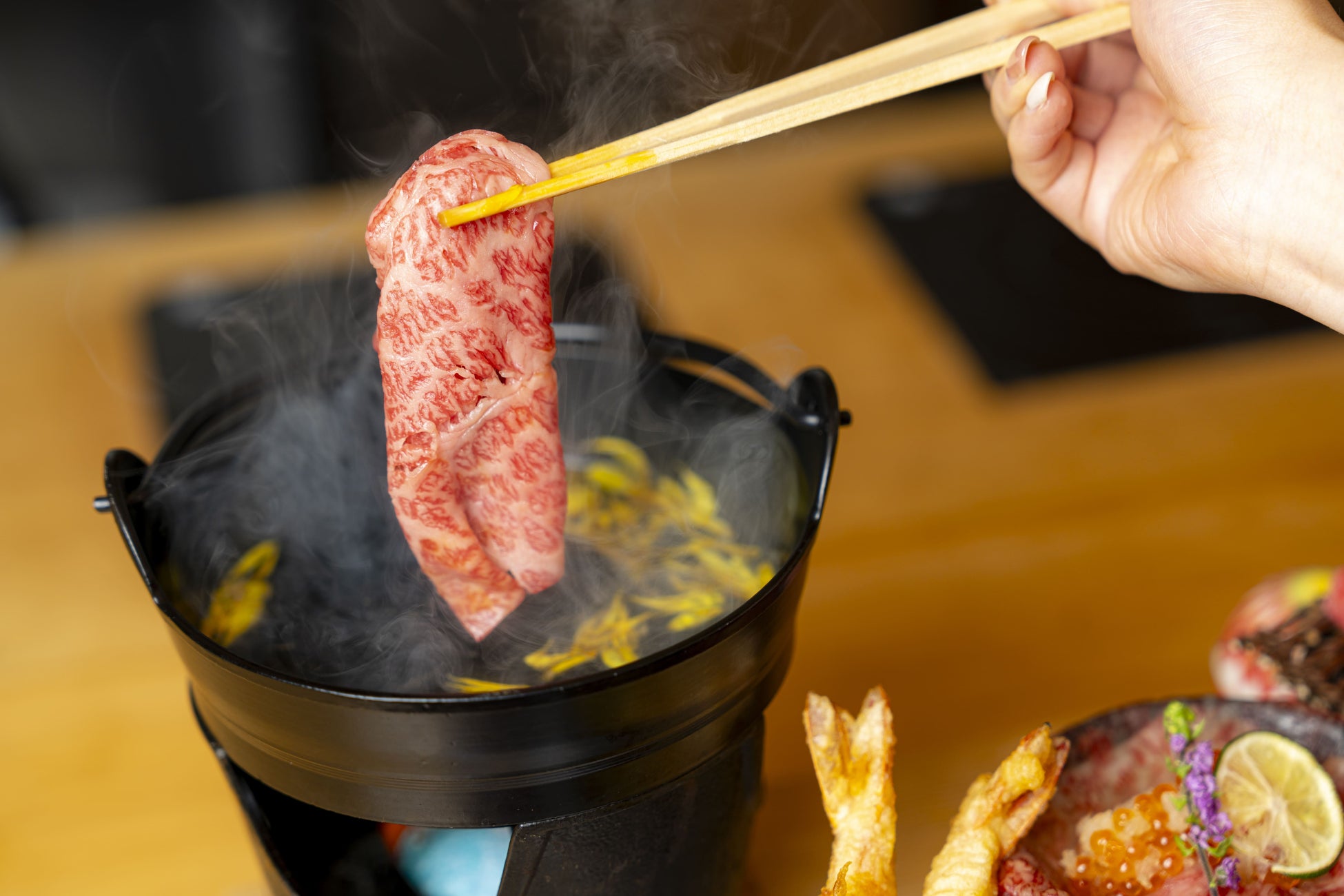 厳選和牛のすき焼きは甘辛の出汁が和牛に染み込み、ひと口ごとに豊かな風味が広がります。