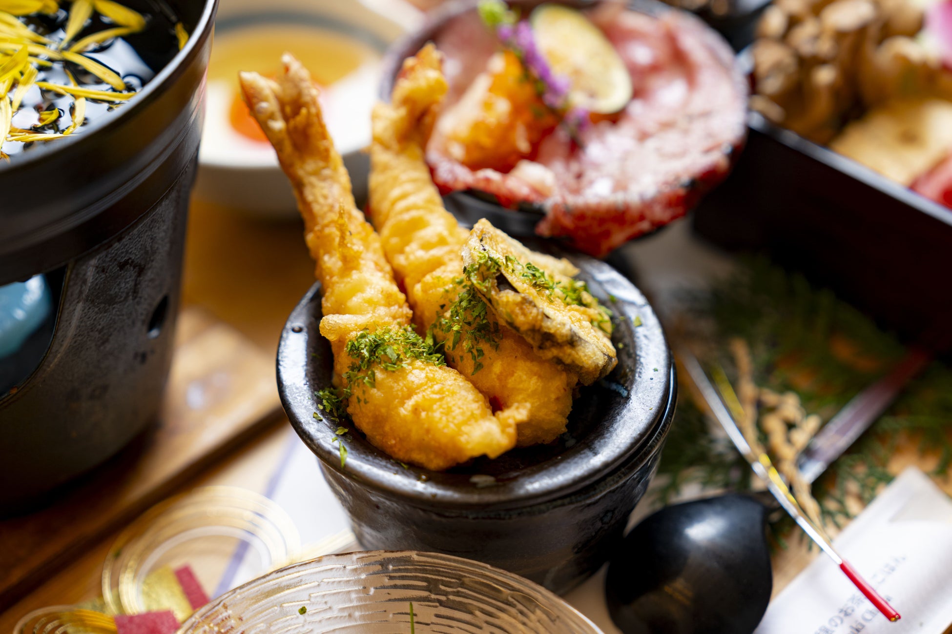 旬の野菜と大ぶりの海老を2尾使った贅沢な天丼を、梅の香りが広がる混ぜご飯と一緒にお楽しみください。