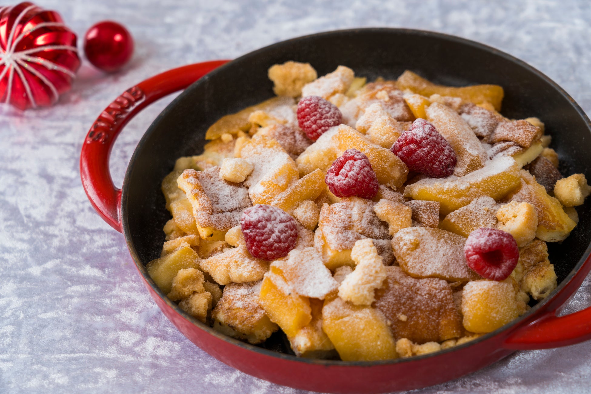シェフが目の前で出来立てのスイーツをご提供するライブステーションでも、クリスマスらしいアイテムをご用意しています。南ドイツやオーストリアの伝統的なパンケーキ「カイザーシュマーレン」は、りんごのキャラメリゼとザクザク食感のアーモンドクランブル、甘酸っぱいラズベリーをトッピングした一品。ブドウとクランベリーのジュースにシナモンやアニス、オレンジなどの柑橘をミックスした、心身ともに温まる「ホットワイン風ドリンク」もご用意しています。