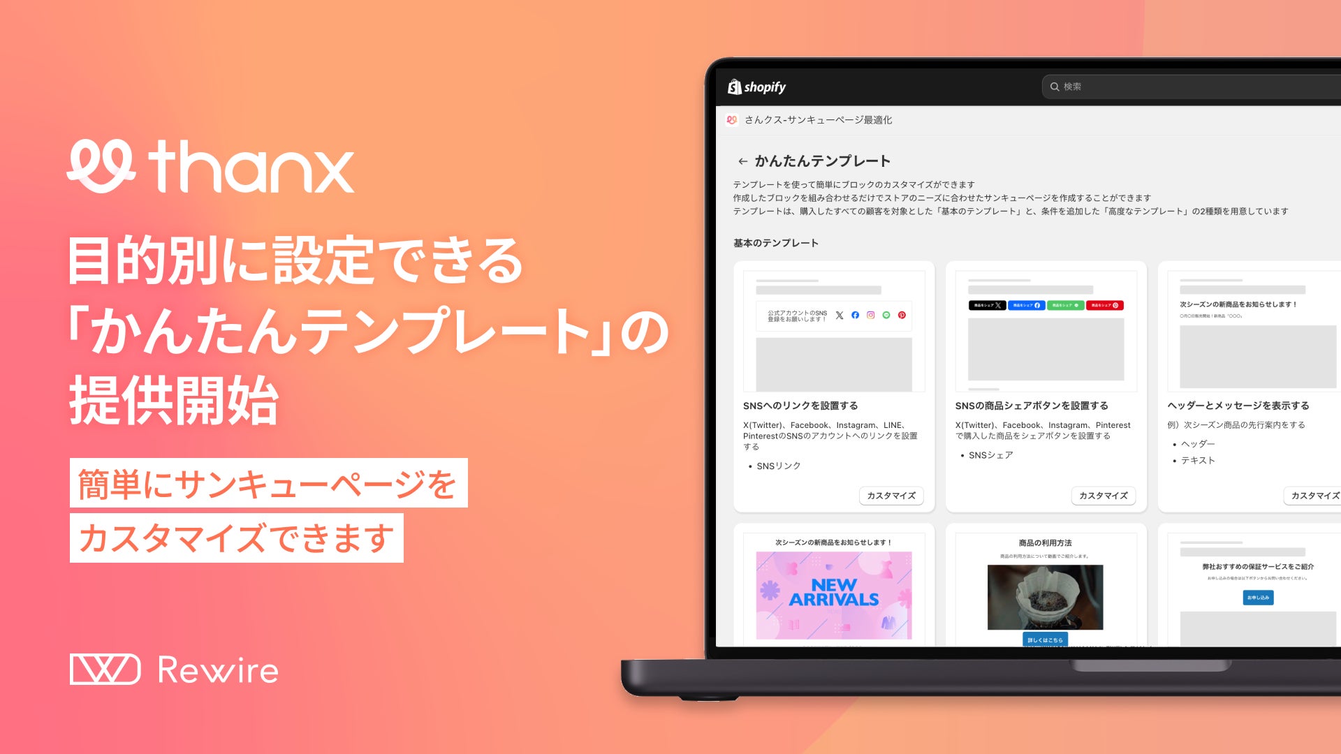 ECシステムの技術支援を行う株式会社リワイア(本社:東京都港区、代表取締役:加藤英也、以下「リワイア」)が提供するサンキューページカスタマイズアプリ「さんクス」は、目的別に設定ができるかんたんテンプレート機能の提供を開始いたしました。