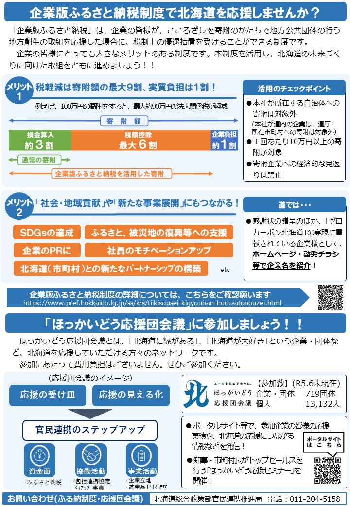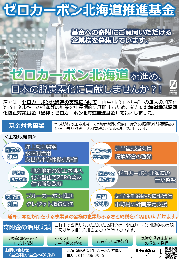 是非、貴社のSDGs、社会貢献、CSR活動の一環として、道内の脱炭素化の取組を進める「ゼロカーボン北海道推進基金」への寄附をご検討いただければ幸いです。