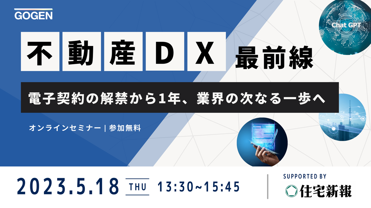 不動産売買に特化した電子契約サービス「Release(レリーズ)」の開発・提供を展開するGOGEN株式会社(本社:東京都港区、代表取締役CEO:和田 浩明)は、2023年5月18日(木)13時30分よりオンラインセミナー「不動産DX最前線 〜電子契約の解禁から1年、業界の次なる一歩へ〜」を開催いたします。