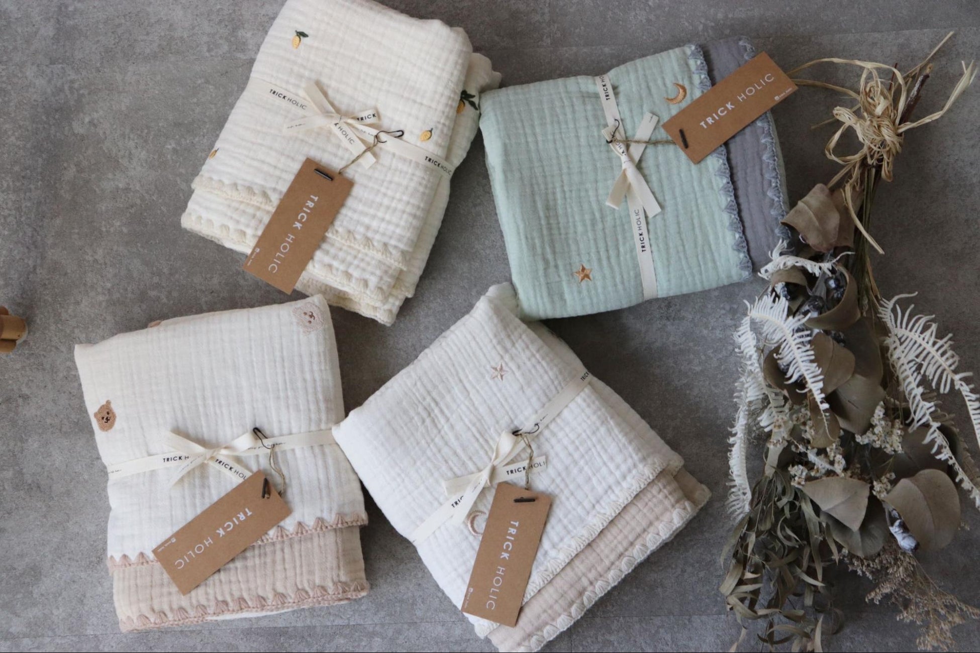 厚みのある6重ガーゼ仕上げで、ベビーカーや、お昼寝時、外出時の日差しをさえぎったり、幅広い使い方のできるブランケット。