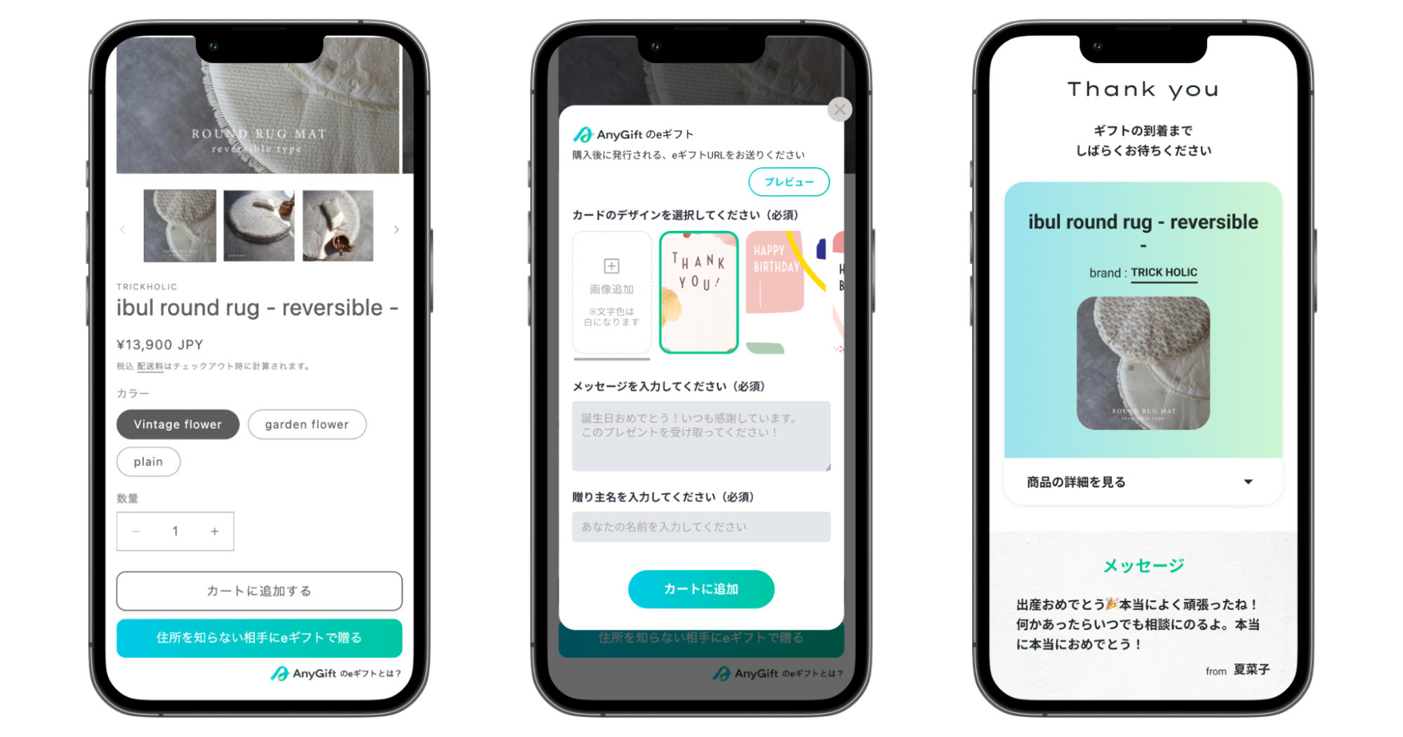TRICK HOLICは本場韓国で生産したオリジナルIbul イブルを中心にベビーからキッズアイテムまで、暮らしやインテリアに馴染む商品をオリジナルで企画生産をしています。TRICK HOLICのアイテムは、出産祝いやお子さんを持つご友人の方へのギフトとしてお選びいただくことが非常に多かったため、お相手の住所を知らなくてもSNSやメールなどで気軽にギフトを贈れるようeギフトサービス『AnyGift』を導入するに至りました。