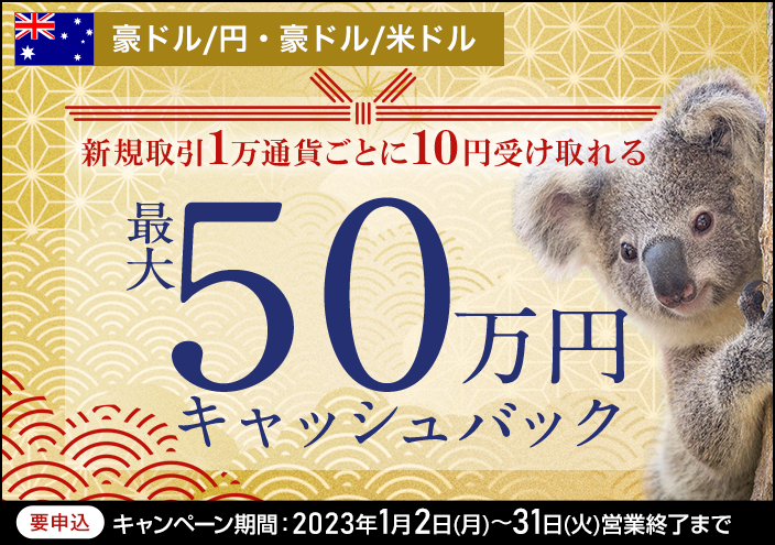セントラル短資FX株式会社(本社:東京都中央区、代表取締役社長:松田 邦夫)は、2023年1月2日から 31日まで豪ドル/円と豪ドル/米ドルの新規取引を対象としたキャッシュバックキャンペーンを実施します。