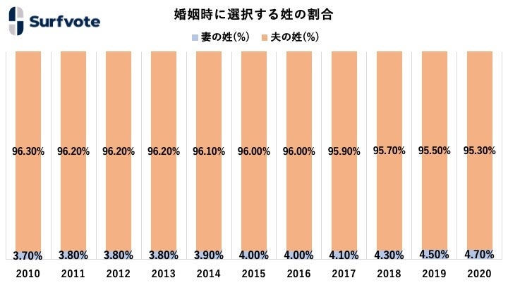 婚姻届には「婚姻後の夫婦の氏」を選択する欄があり、夫の氏か妻の氏かを選ぶ形式になっています。男女共同参画局の2020年「夫の姓・妻の姓別にみた婚姻件数」では、僅かながら妻の姓を選択する件数が年々増えていますが、それでも2020年は95.3%が夫の姓を選択しています。