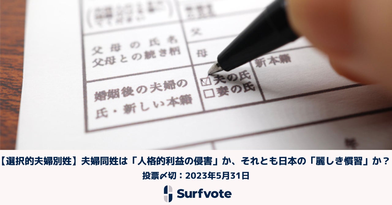 【選択的夫婦別姓】夫婦同姓は「人格的利益の侵害」か、それとも日本の「麗しき慣習」か?社会課題に参加できるSNS Surfvoteで3回目の投票開始