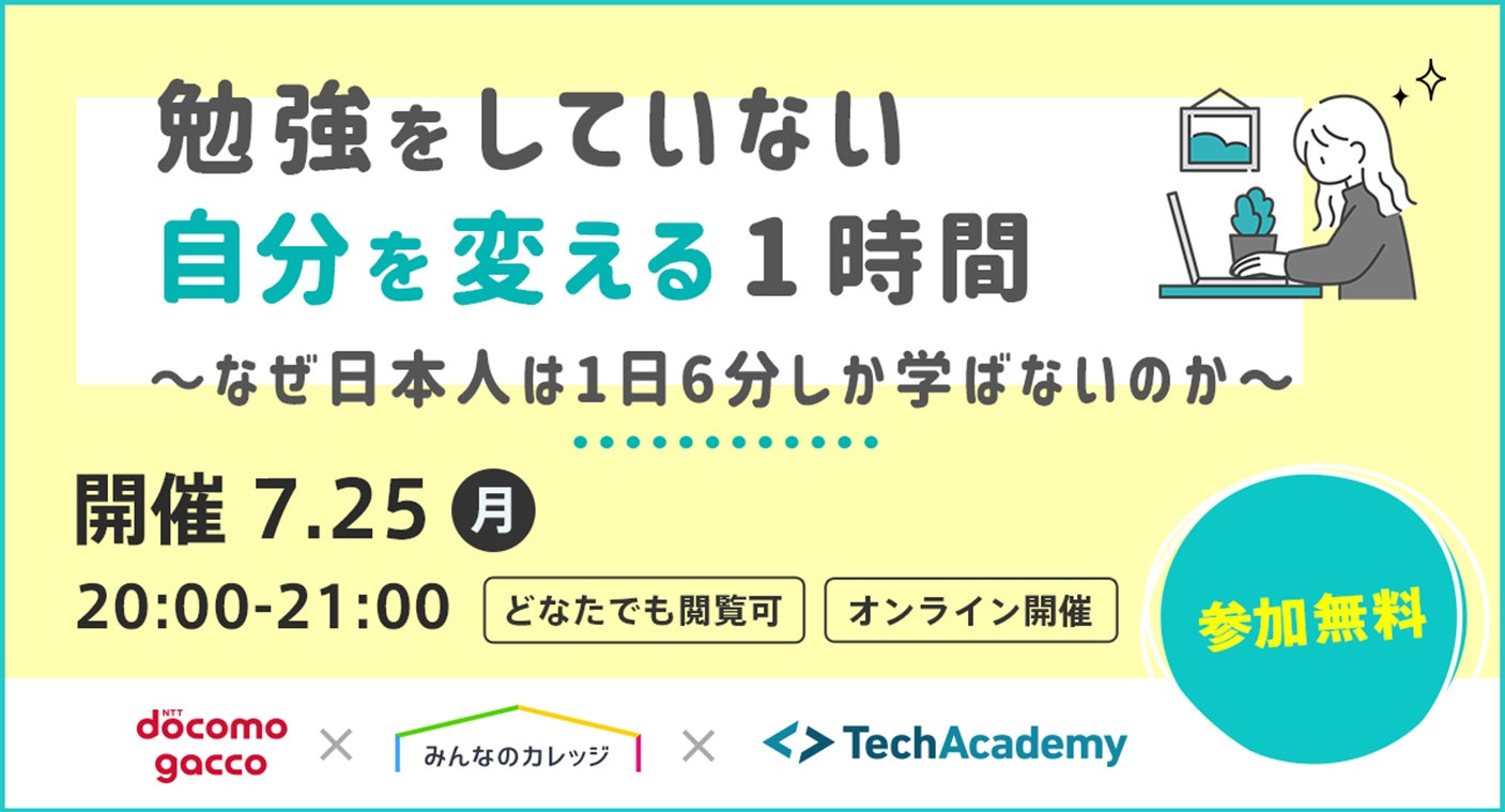 株式会社ドコモgacco(東京都港区、代表取締役社長 佐々木 基弘、以下「ドコモgacco」)は、2022年7月25日(月)20時〜21時に、「大人の学び」と「仕事」をテーマにしたウェビナー「勉強をしていない自分を変える1時間〜なぜ日本人は1日6分しか学ばないのか〜」を無料で開催します。本ウェビナーはオンラインコミュニティ型の学びの場「みんなのカレッジ」を運営する株式会社クラウドワークス(本社:東京都渋谷区、代表取締役社長 兼 CEO 吉田 浩一郎、以下「クラウドワークス」)、オンラインプログラミングスクール「テックアカデミー」を運営するキラメックス株式会社(本社:東京都渋谷区、代表取締役社長 樋口 隆広、以下「キラメックス」)との3社共同開催となります。自発的に学ぶ時間が取れていない人、何から学び始めれば良いかわからない人、学習したことを仕事に活かす方法がわからない人の学習に関する悩みを解決し新たな一歩を踏み出せるように、学びの傾向や事例、自分にあった学びの選択方法についてパネルディスカッション形式で解説します。