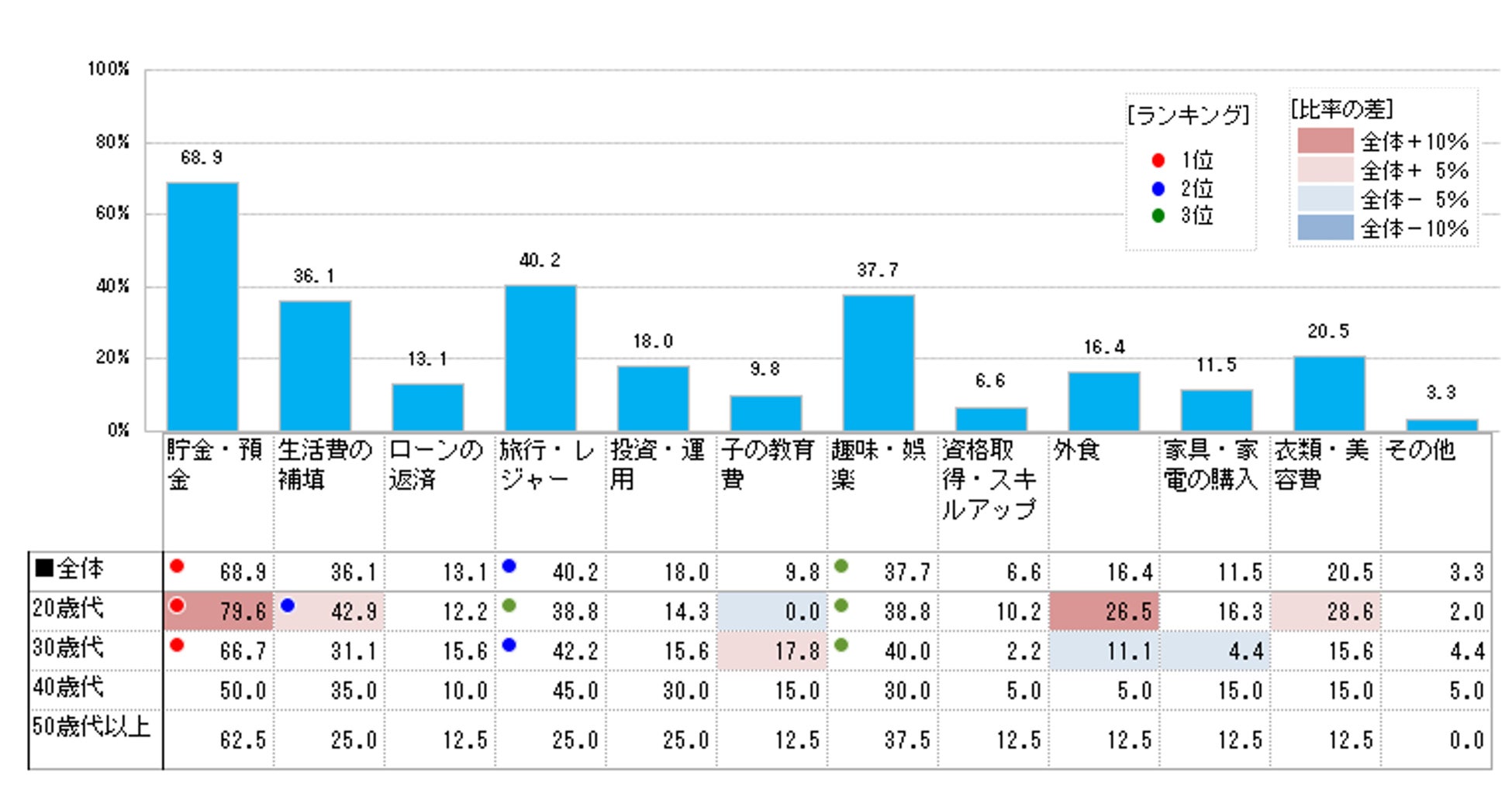 賞与の使い道のトップは「貯金・預金」。20歳代では2位に「生活費の補填」も