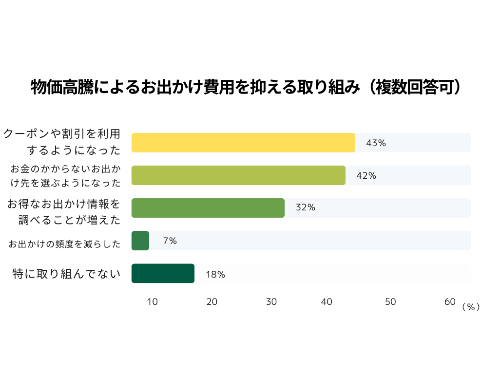 お出かけに伴う予算を抑えるため、どんな取り組みをしているのか調査したところ、クーポンを利用したり、お得な情報を調べたりと、8割以上の方が何かしらの「節約」に取り組みながら、お出かけを楽しもうとしていることがわかります。