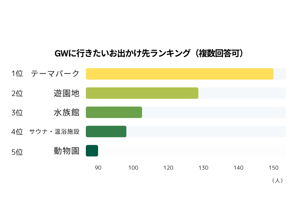 GWに行きたいお出かけ先を調査したところ、1位はテーマパーク(150人)でした。