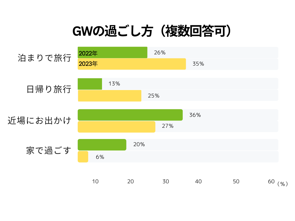 お出かけが好きな方へ、今年のGWの過ごし方について調査をしたところ、「旅行」を選択する方が多いことがわかりました。これは、2022年に実施した同調査と比較しても、「日帰り旅行」は12ポイント、「泊まりで旅行」は9ポイント高くなっております。一方で、「家で過ごす」と回答した人は6%と昨年と比較し14ポイント低いという結果となりました。