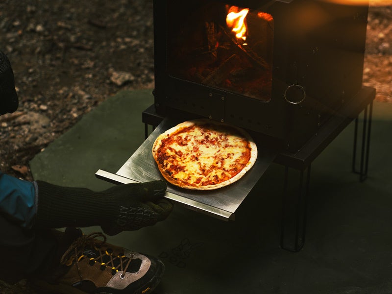 本体の上部では鍋料理、内部ではオーブン料理、下部ではピザ(専用ピザピールも付属)、など3箇所同時調理を実現。冬キャンプの食事メニュー一式を担える1台に仕上げました。