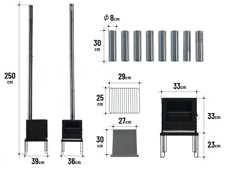 製品名:ピザがまきちゃん 型番・カラー:MS1-132-BK・ブラック 販売価格(税込):48,400円 サイズ:[全体組立時] (約)W36×D39×H250cm [ストーブ本体] (約)W33×D36×H33cm [煙突直径] (約)8.1cm 収納サイズ:(約)W40×D40×H35cm 総重量:(約)17kg 材質:[製品本体(薪ストーブ)、煙突受け部、ロストル、テーブル] スチール [二時燃焼構造体、煙突、煙突固定リング、ワイヤーロープ] ステンレス [キャリーバッグ] ポリエステル 静止耐荷重:[テーブル]40kg セット内容: 製品本体(薪ストーブ)、ピザピール、オーブンラック、煙突受け部、煙突(下部)、煙突(中間部)×6本、煙突(上部)、煙突固定リング、ワイヤーロープ×3本、ロープ×3、ペグ×3本、灰受け、テーブル、キャリーバッグ |