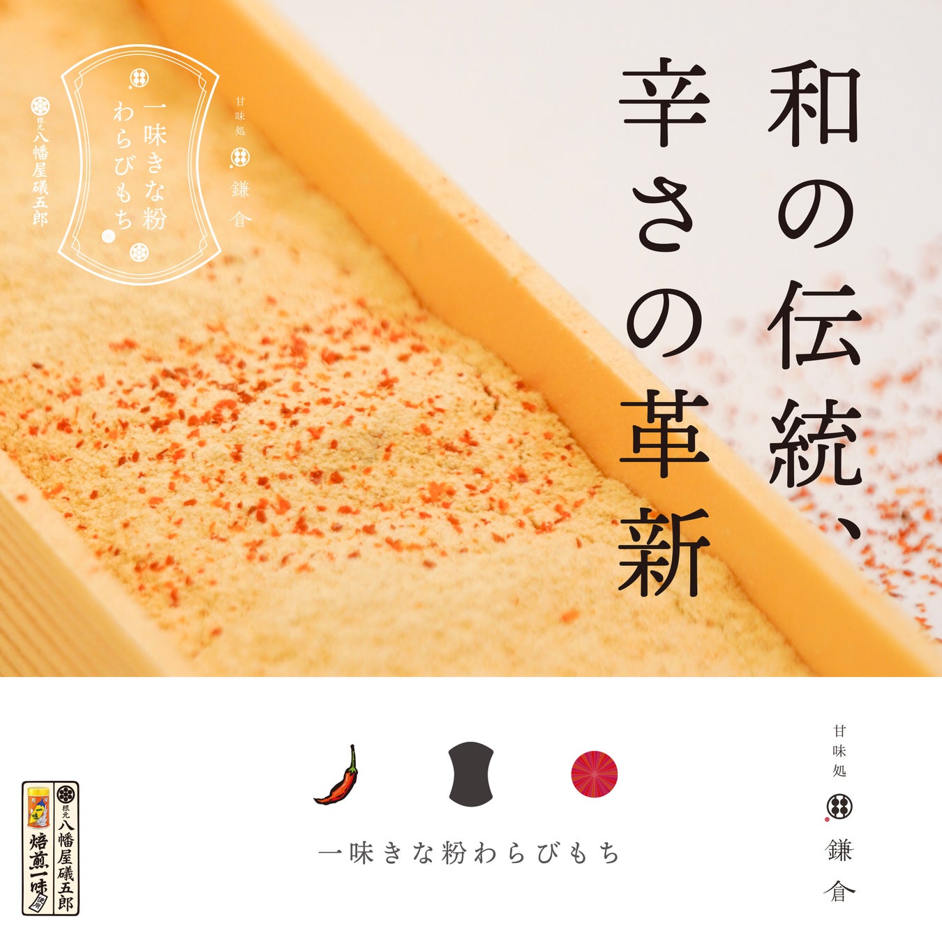 江戸時代より約280年続く、歴史と伝統が誇る、長野県の七味唐辛子メーカー“八幡屋礒五郎”の焙煎一味を使用した、八幡屋礒五郎 焙煎一味使用『一味きな粉わらびもち』は、最高のもっちり感ととろける口溶けの鎌倉わらびもちに一味きな粉の相性が非常に良く、これまでにない革新の逸品に仕上がりました。