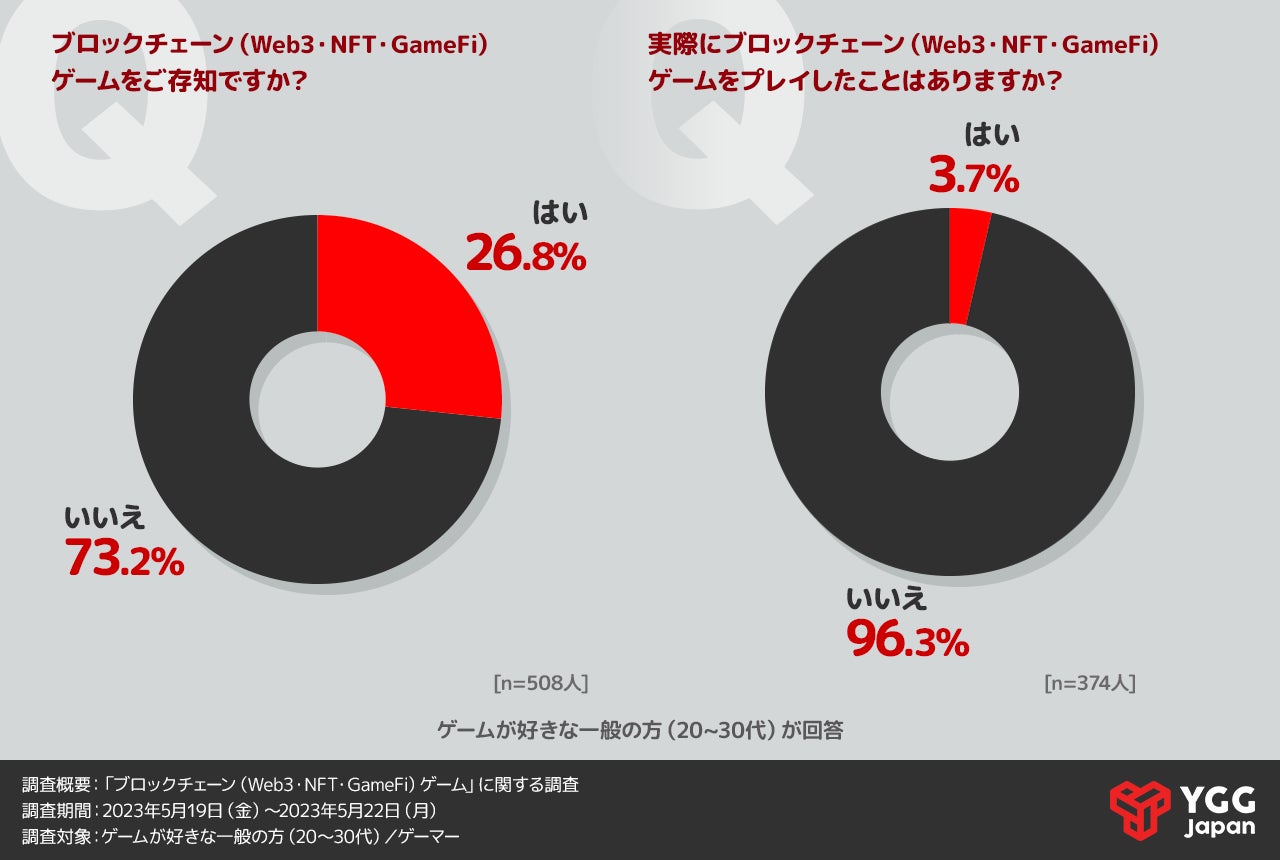 「ブロックチェーン(Web3・NFT・GameFi)ゲームをご存知ですか?」と質問したところ、『はい(26.8%)』『いいえ(73.2%)』という回答結果になりました。
