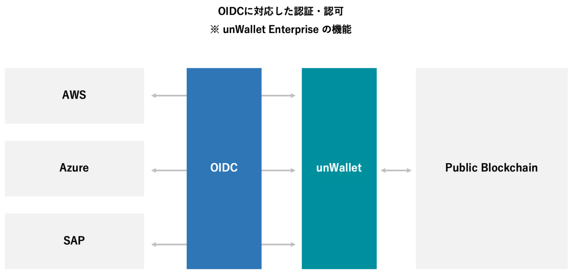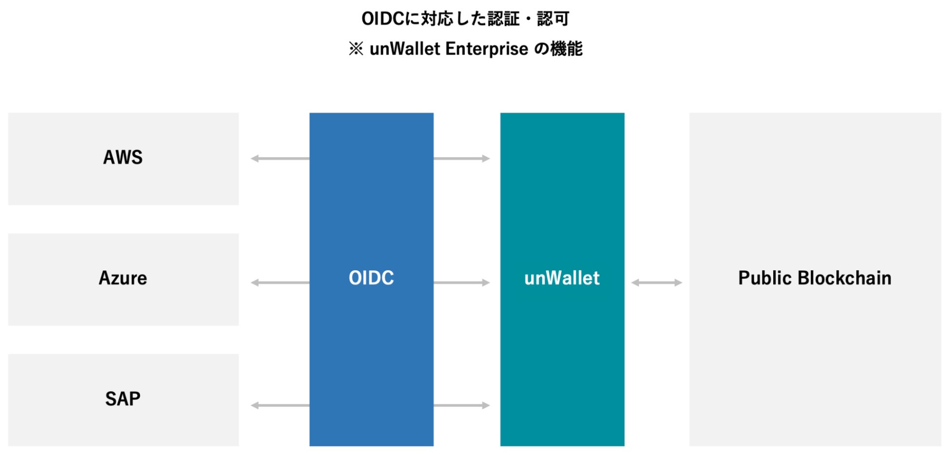 unWalletはOIDCに対応したIdentity Providerとして機能(unWallet EnterprizeというSaaSの機能)します。そのため、OIDCで接続するだけで クライアントサイドでの鍵管理や電子署名などWeb3サービスで必要な仕組みをユーザーに提供することができます。これにより、AWSやAzureの認証フローに組み込んだり、既存のID管理システムと連携することが可能となります。加えて、CRMとの連携などを通じて顧客の行動や好みをより詳細に分析し、パーソナライズされたサービスやプロモーションを提供することができるようになります。また、ユーザー自身もunWalletを通じて技術的な障壁を感じることなく、自分のアクティビティに応じた限定体験を享受できるなど、一般的なアプリケーションサービスの延長で豊かなオンチェーン体験をすることができます。