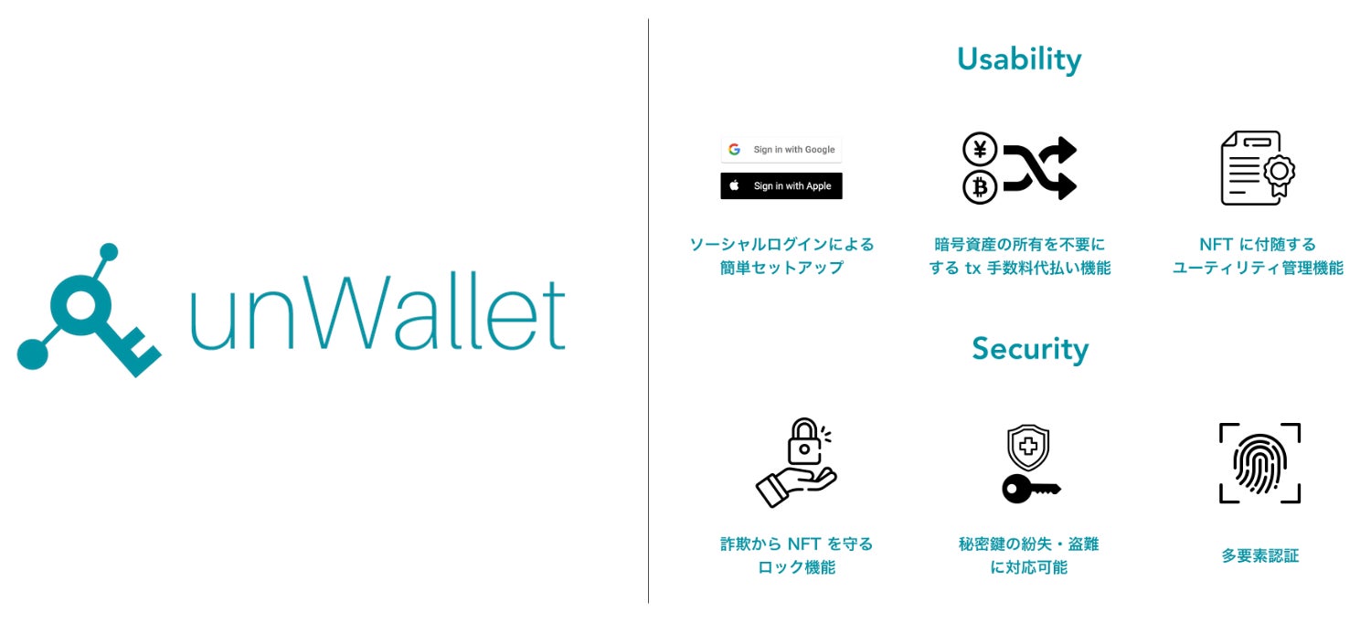 NFT用のコントラクトウォレット「unWallet(アンウォレット)」の開発・提供をする会社です。unWalletは、ノンカストディアルウォレットでありながら使い慣れたソーシャルログインでウォレットが入手でき、シードフレーズの管理も不要です。また、秘密鍵の紛失・盗難に対応するためのリカバリー機能、メタトランザクションによる暗号資産レスな NFT 操作、詐欺から NFT を保護するロック機能など、EOA では実現できない機能を実現できます。