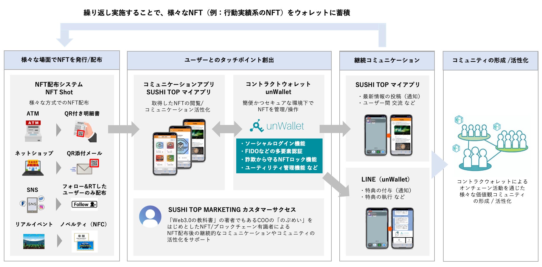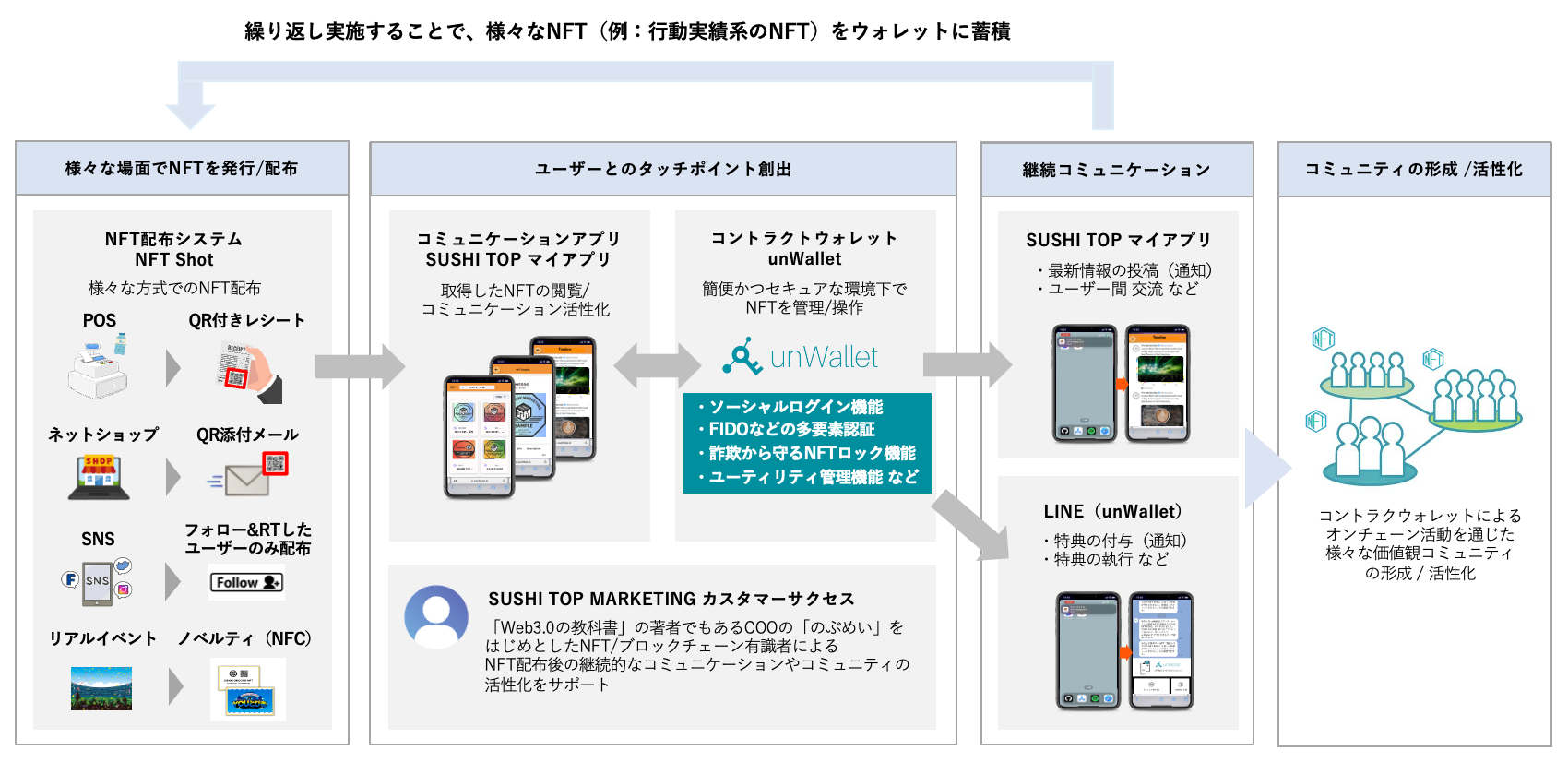 SUSHI TOP マイアプリとunWalletの連携により、ユーザーはNFTとそれに関連する限定情報や特典を一元管理できます。また、企業はNFTを配布して終わりではなく、特定のNFT保有者に対して、SUSHI TOP マイアプリとLINE(unWallet)の双方でのコミュニケーション(例:限定情報)や特典の提供が可能となり、様々なNFTを介した価値観コミュニティの形成と活性化を支援します。